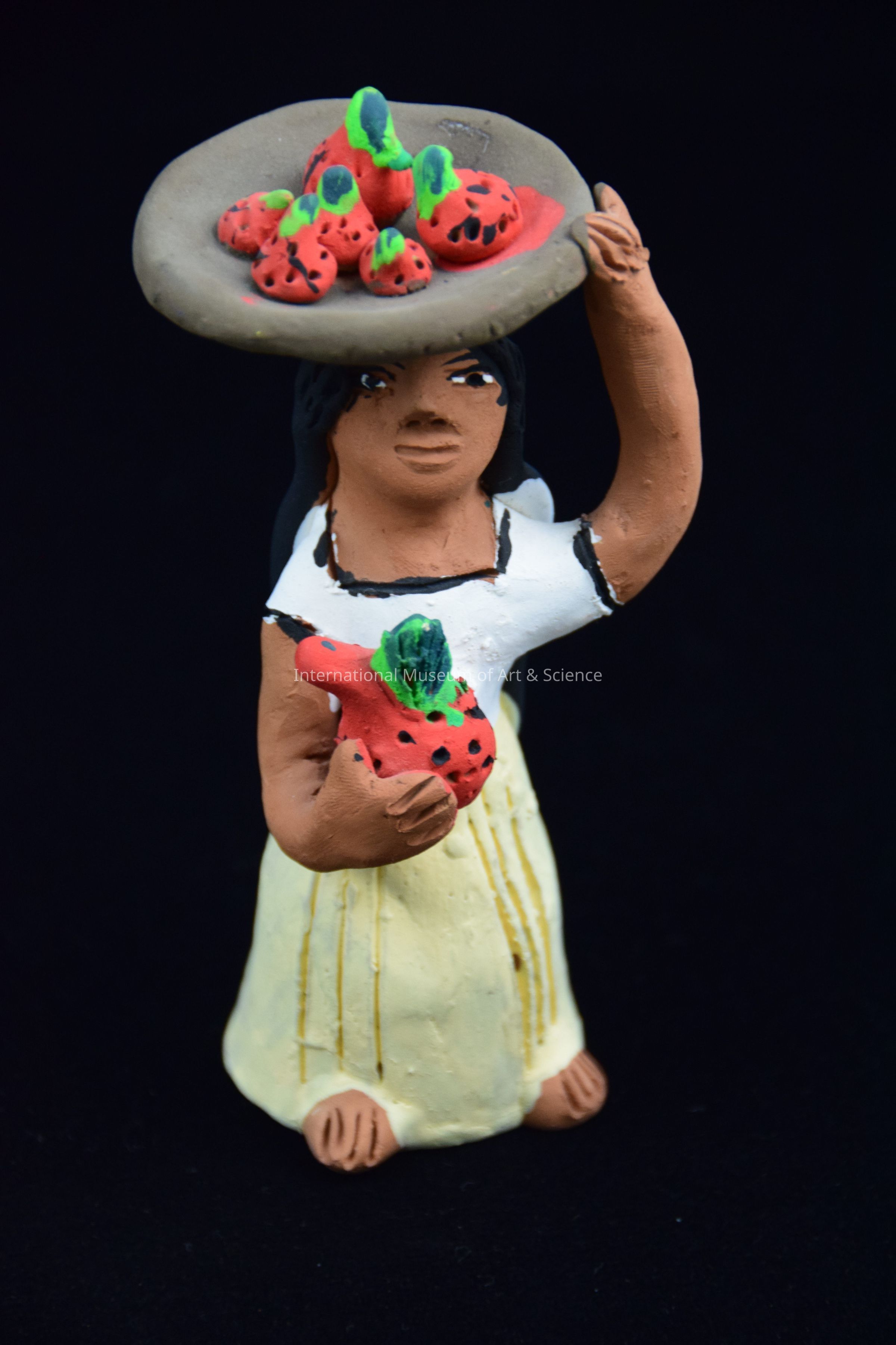 A clay figurine of a woman holding a a platter of strawberries on her head and one in her left hand. She is part of a scene of "Market Women".