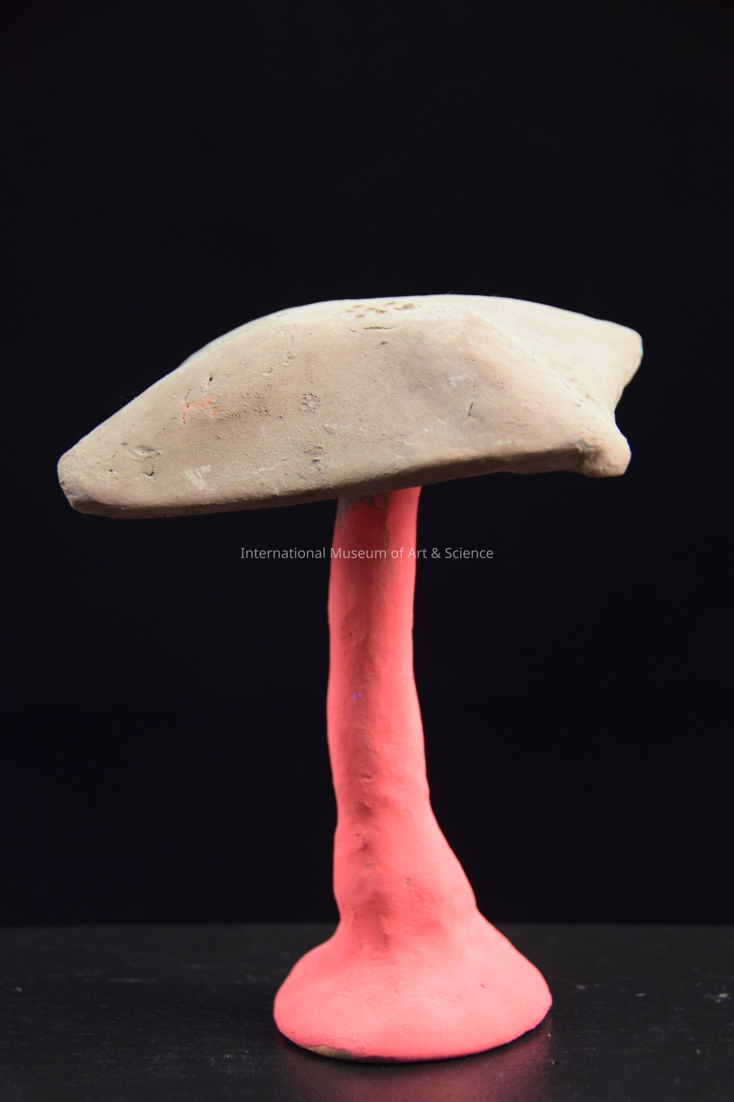 A cermic figurine of a standing umbrella. The umbrella/tent top is painted grey and its pole and base are a peachy pink. It it part of a market scene.