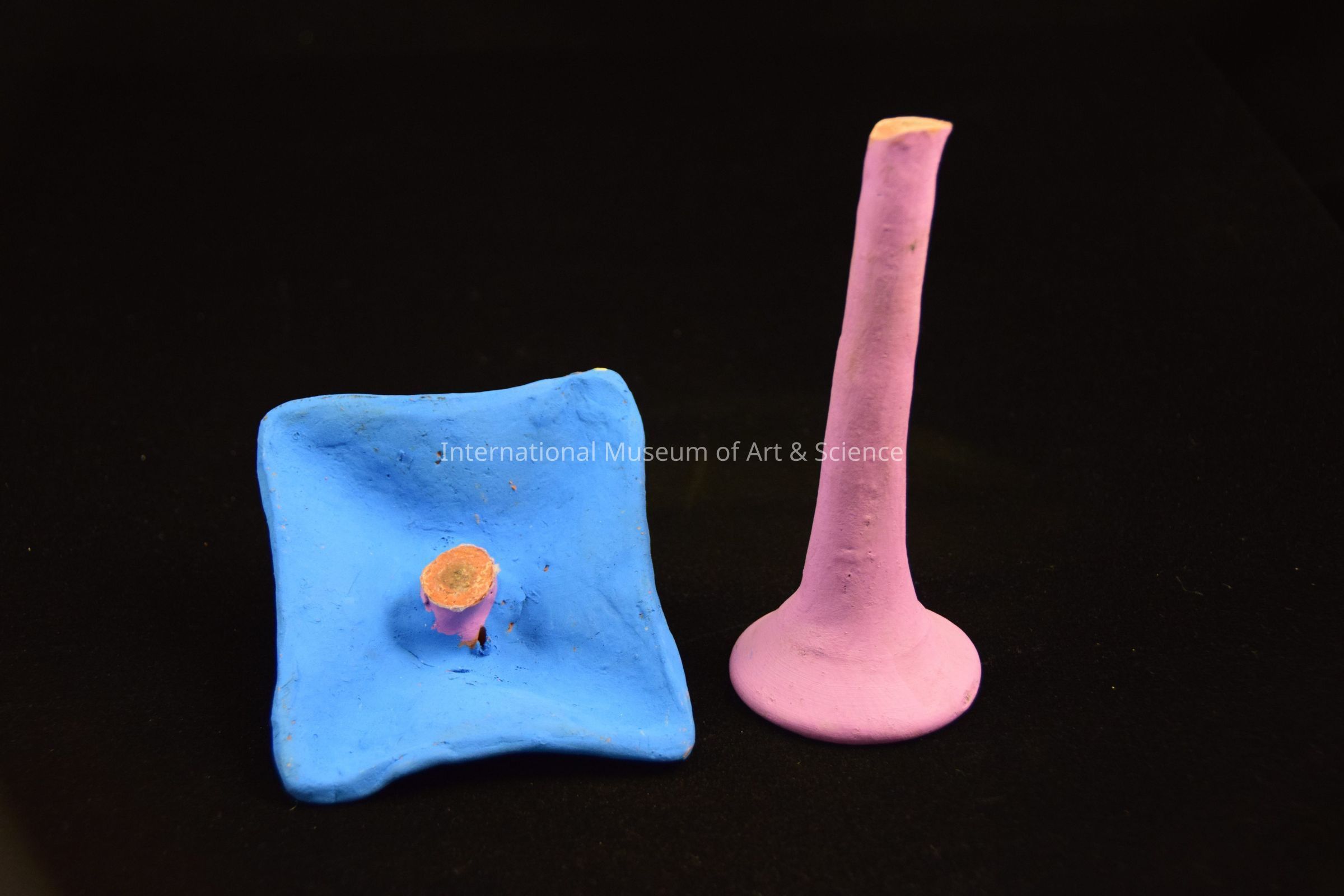 A cermic figurine of a standing umbrella. The umbrella/tent top is painted blue and its pole and base are a lilac purple. It it part of a market scene.