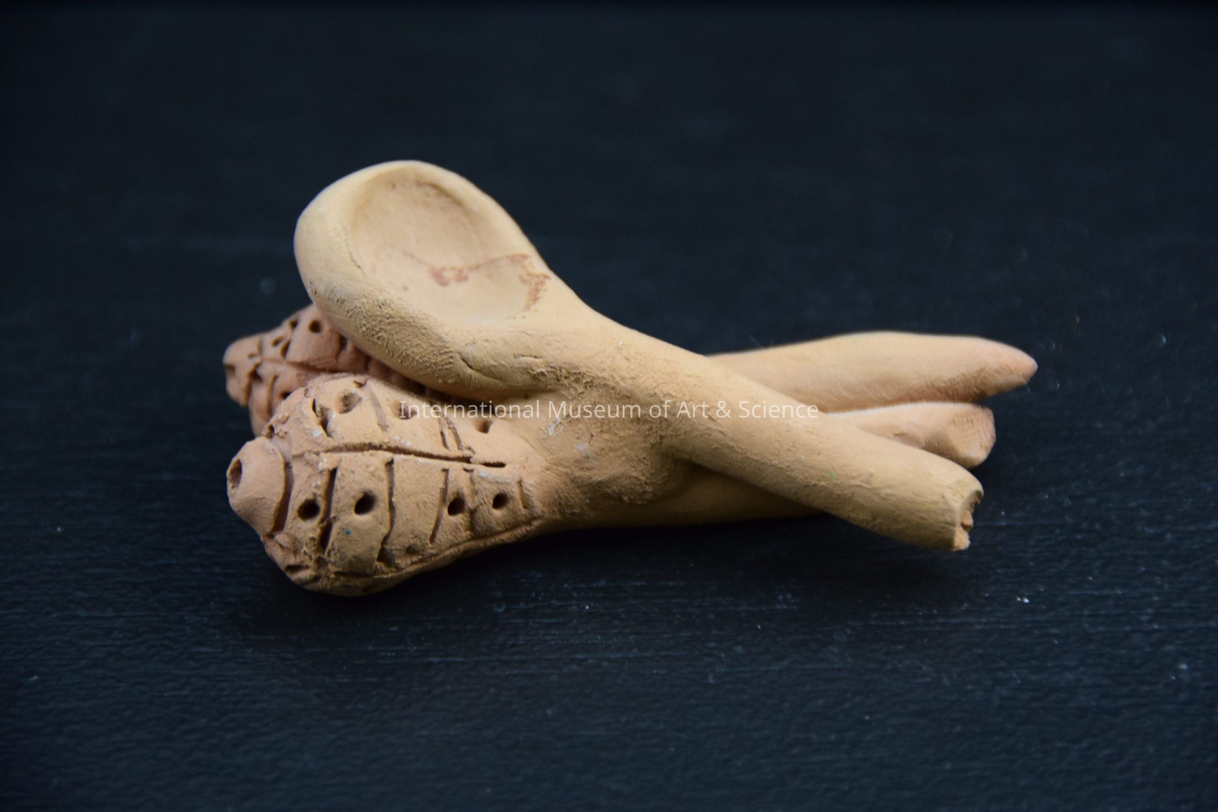 A ceramic figurine of unpainted kitchen utensils. There are three utensils in the grouping, one spoon and two chocolate beaters. This is part of a Market Scene where men sit and eat at the table with vendors in the background.