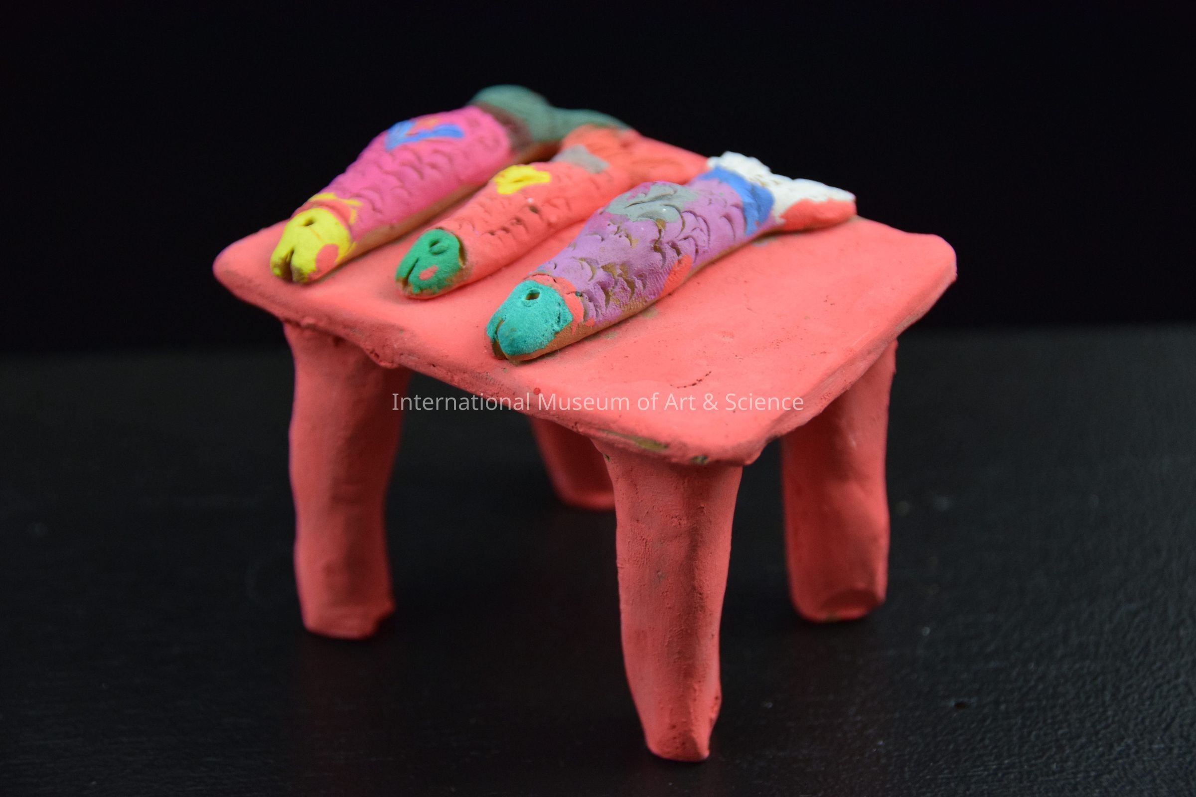 A ceramic figurine of a table. The table has been painted a coral color. There are three multicolored fish sitting on the tabletop. This is part of a Market Scene where men sit and eat at the table with vendors in the background.