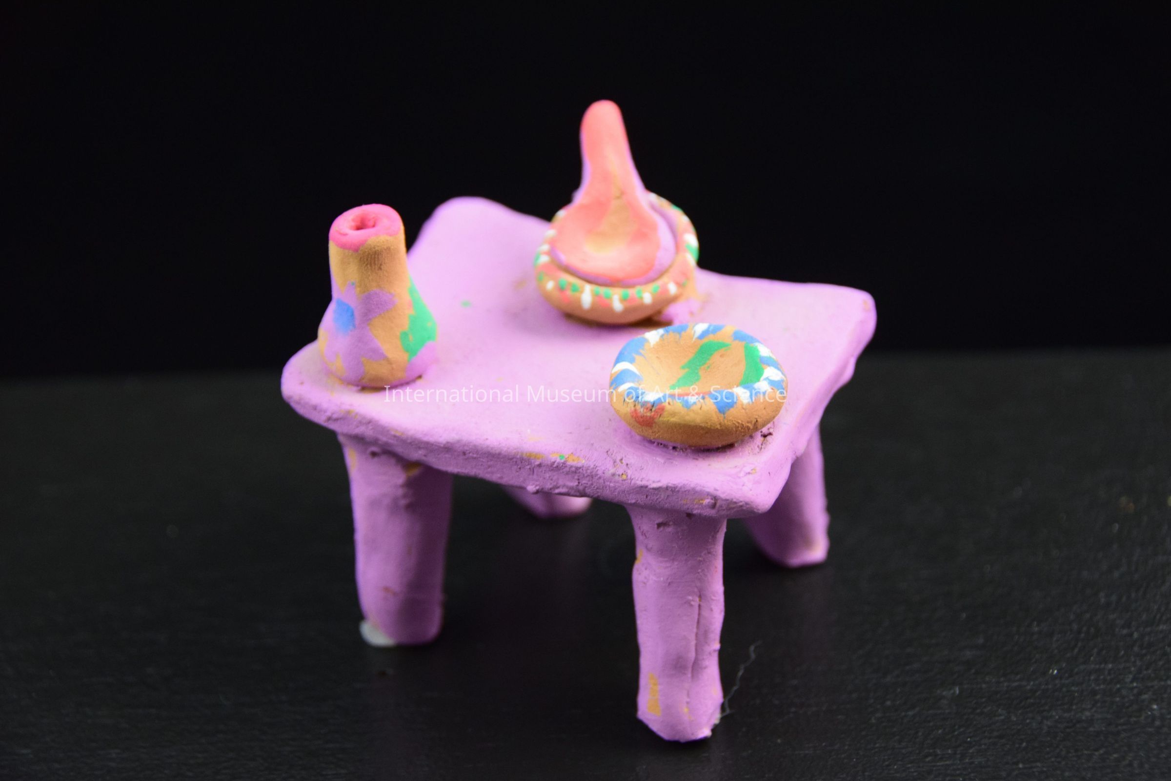 A ceramic figurine of a table. The table has been painted purple. There are four items on the table: a vase, two bowls, and a spoon to go with one of the bowls. The four pieces are detailed with color and floral motifs. This is part of a Market Scene where men sit and eat at the table with vendors in the background.
