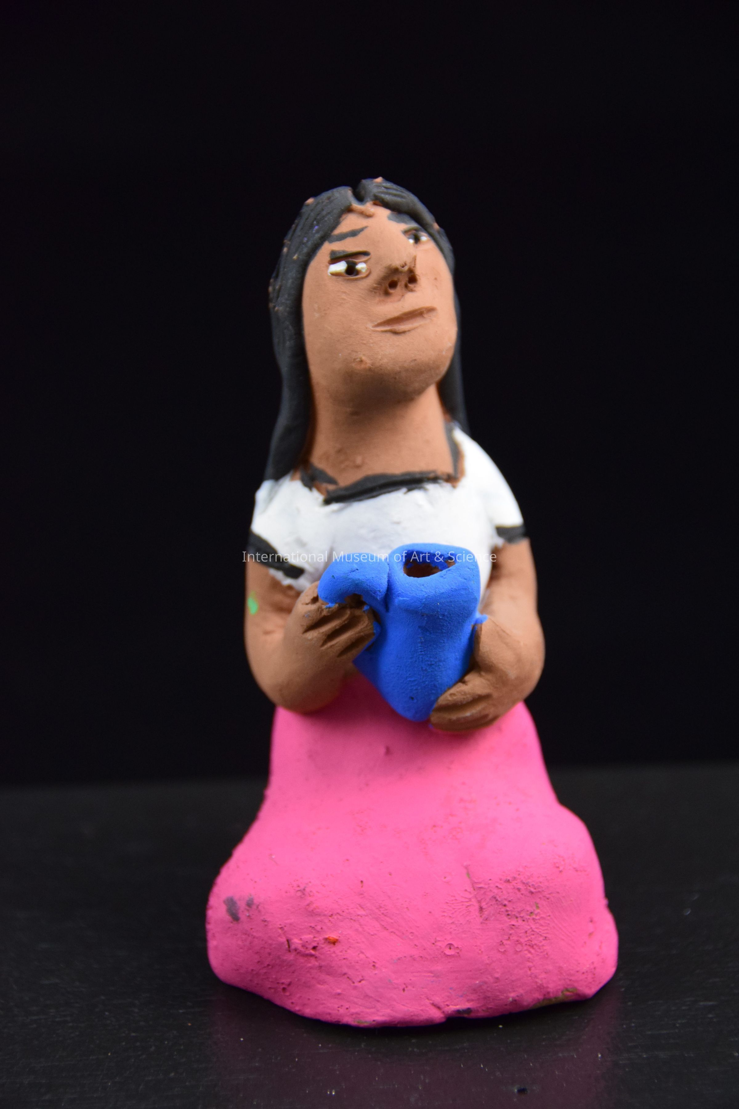 A ceramic figurine of woman. She is in a kneeling position. She is wearing a white blouse with black trim and a dark pink skirt. She is holding a blue pitcher in her hands. This is part of a Market Scene where men sit and eat at the table with vendors in the background.