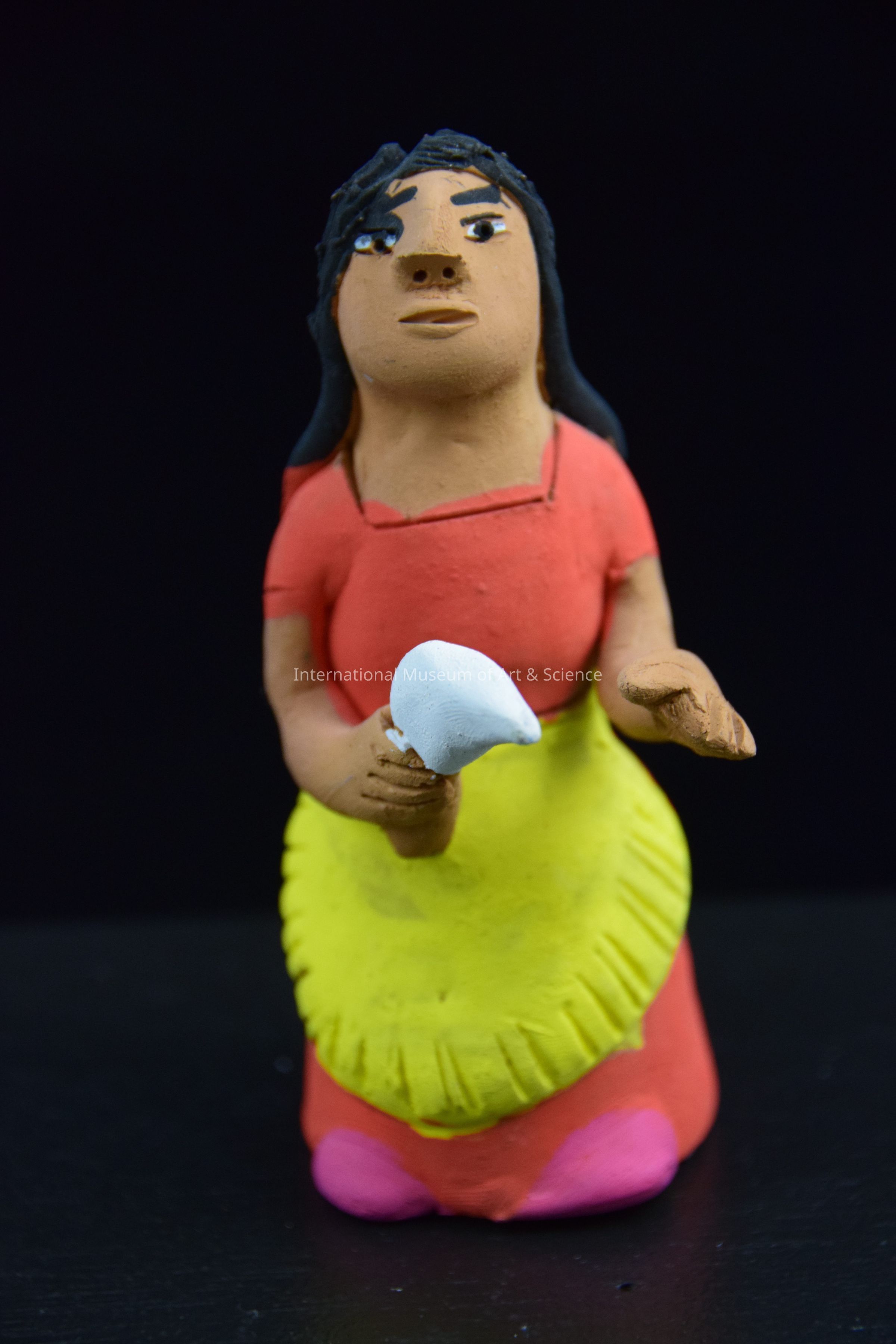 A ceramic figurine of woman. She is wearing an orange dress, a yellow apron, and pink shoes. She is holding a knife in her right hand. This is part of a Market Scene where men sit and eat at the table with vendors in the background.