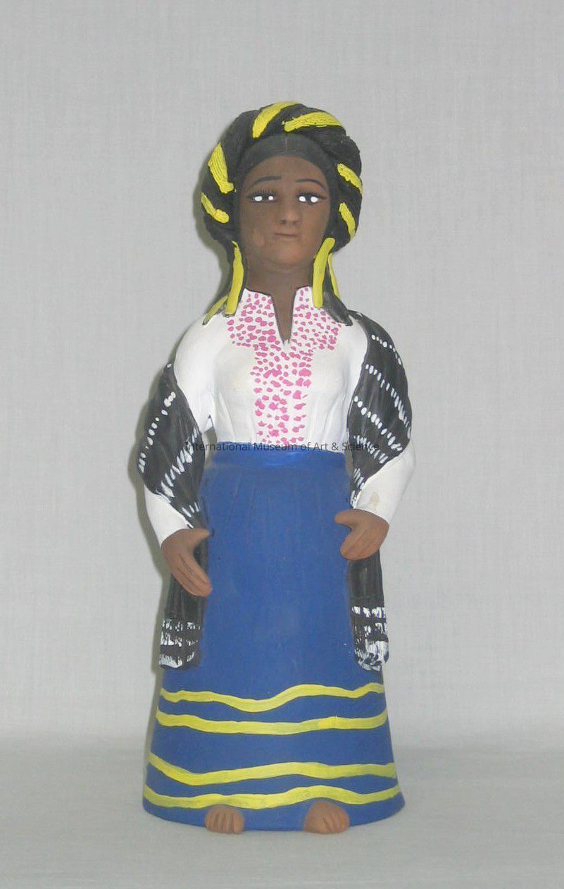 A clay figurine of a woman. She is wearing a white shirt with pink detailing, a blue skirt with yellow stripes, and a brown shawl with white stripes. She also has yellow earrings and a yellow ribbon woven into the braid on her head.Made/Created