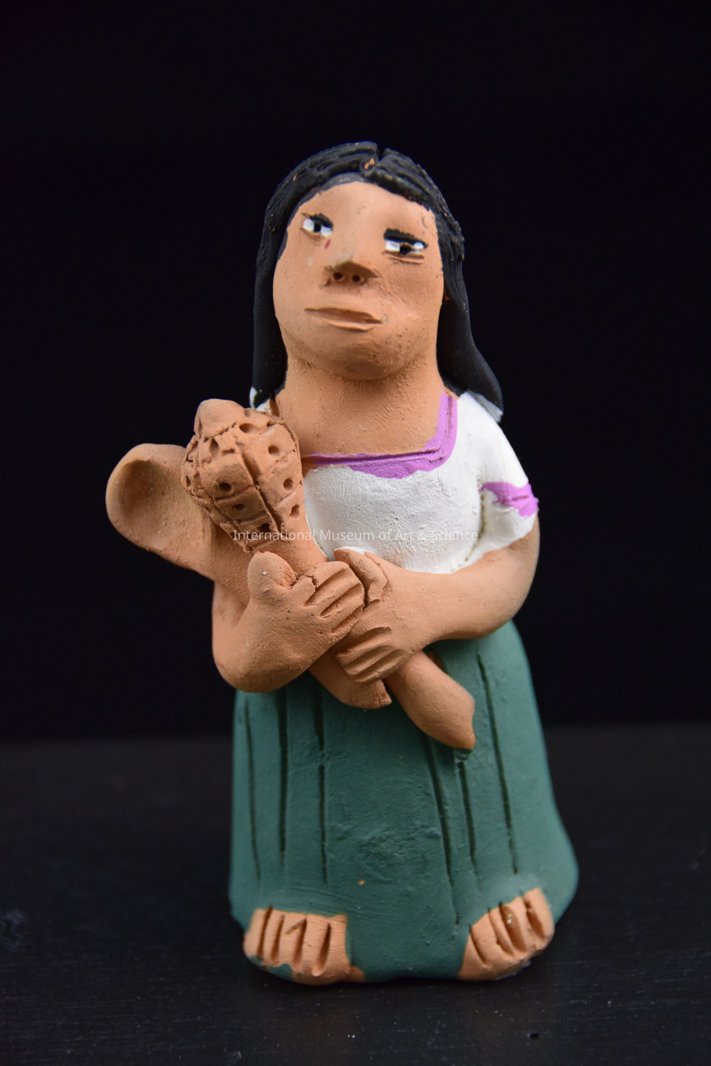 A ceramic figurine of woman. She is wearing a white blouse with purple trim and a dark green skirt. She is holding two kitchen utensils in her hands. This is part of a Market Scene where men sit and eat at the table with vendors in the background.
