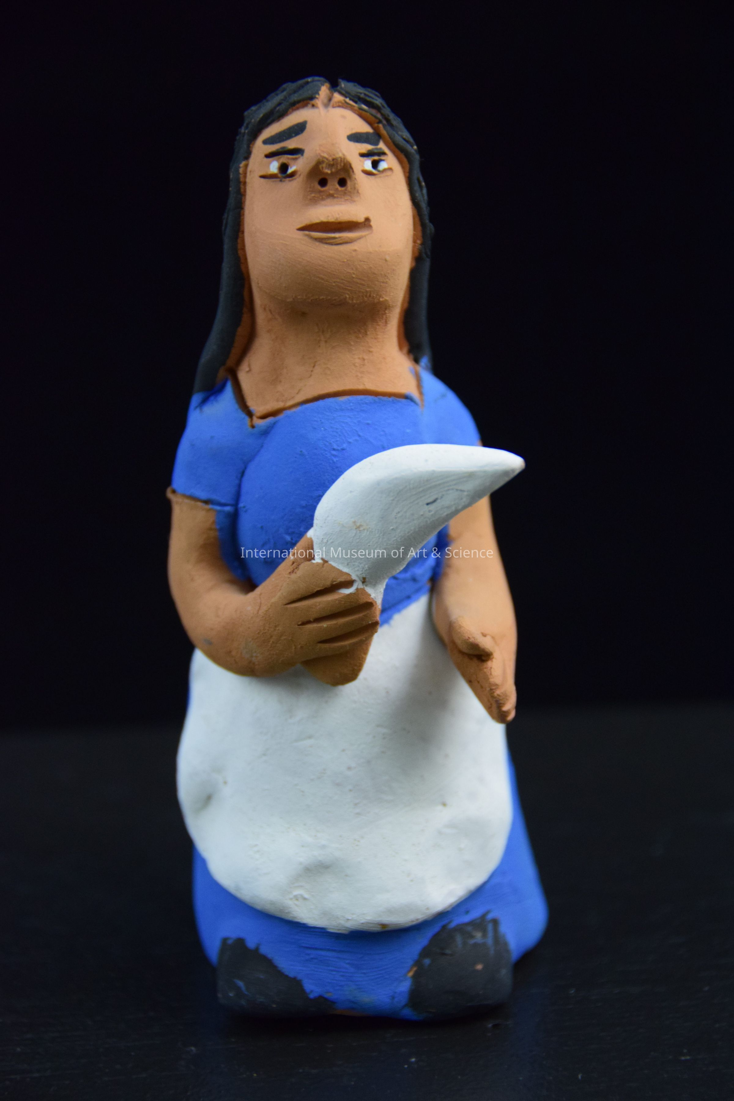 A ceramic figurine of woman. She is wearing an blue dress, a white apron, and black shoes. She is holding a knife in her right hand. This is part of a Market Scene where men sit and eat at the table with vendors in the background.