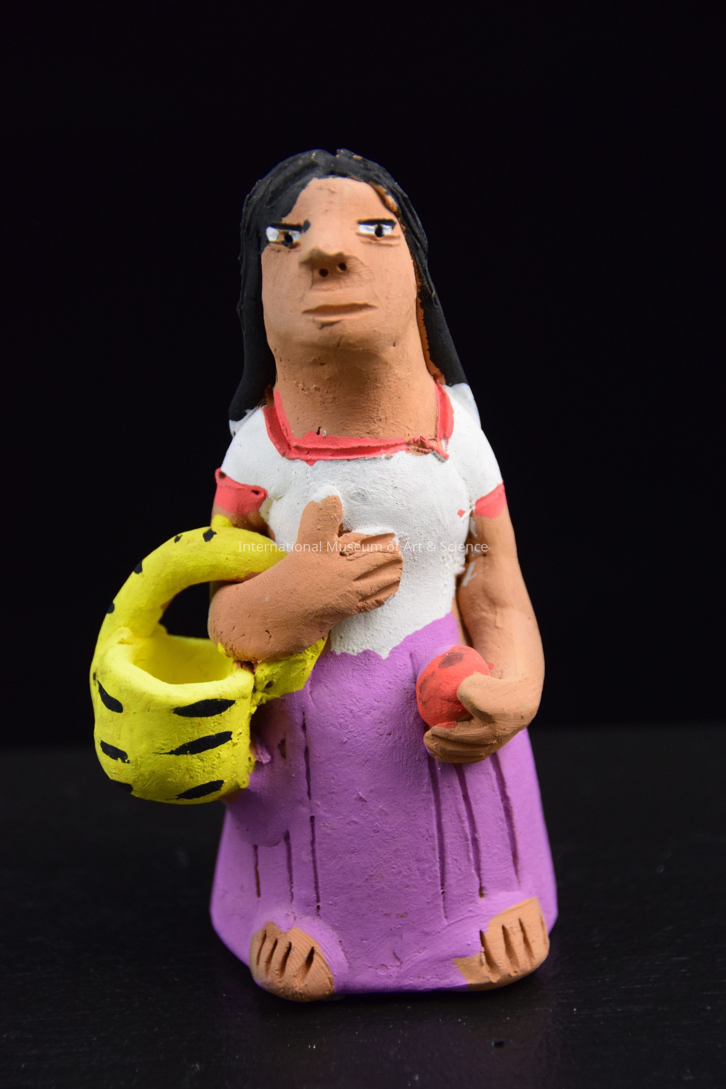 A ceramic figurine of woman. She is wearing a white blouse with pink trim and a purple skirt. She has a yellow basket under her right arm and a red apple in her left hand. This is part of a Market Scene where men sit and eat at the table with vendors in the background.