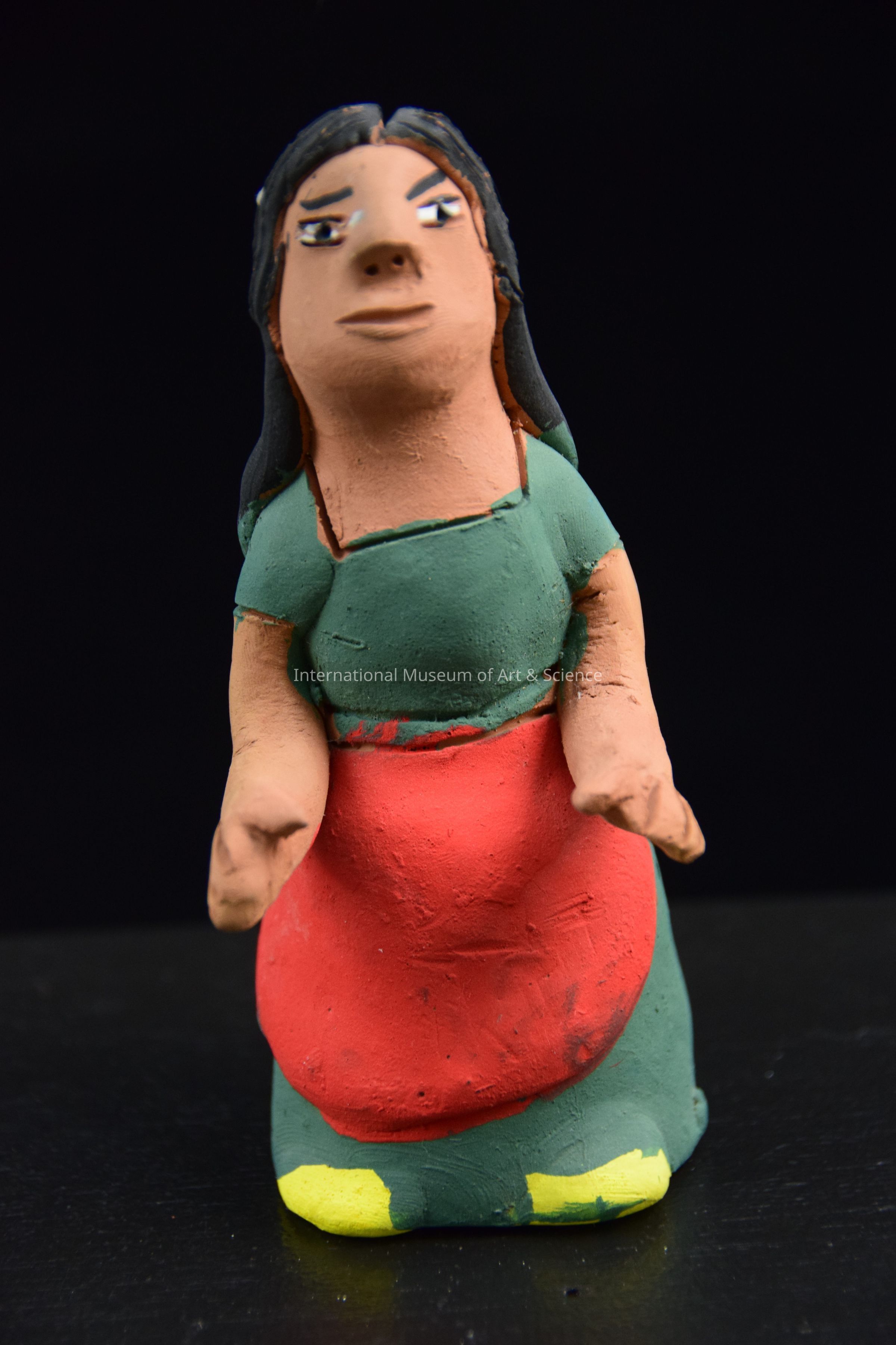 A ceramic figurine of woman. She is wearing a dark green dress with a red apron, and yellow shoes. This is part of a Market Scene where men sit and eat at the table with vendors in the background.