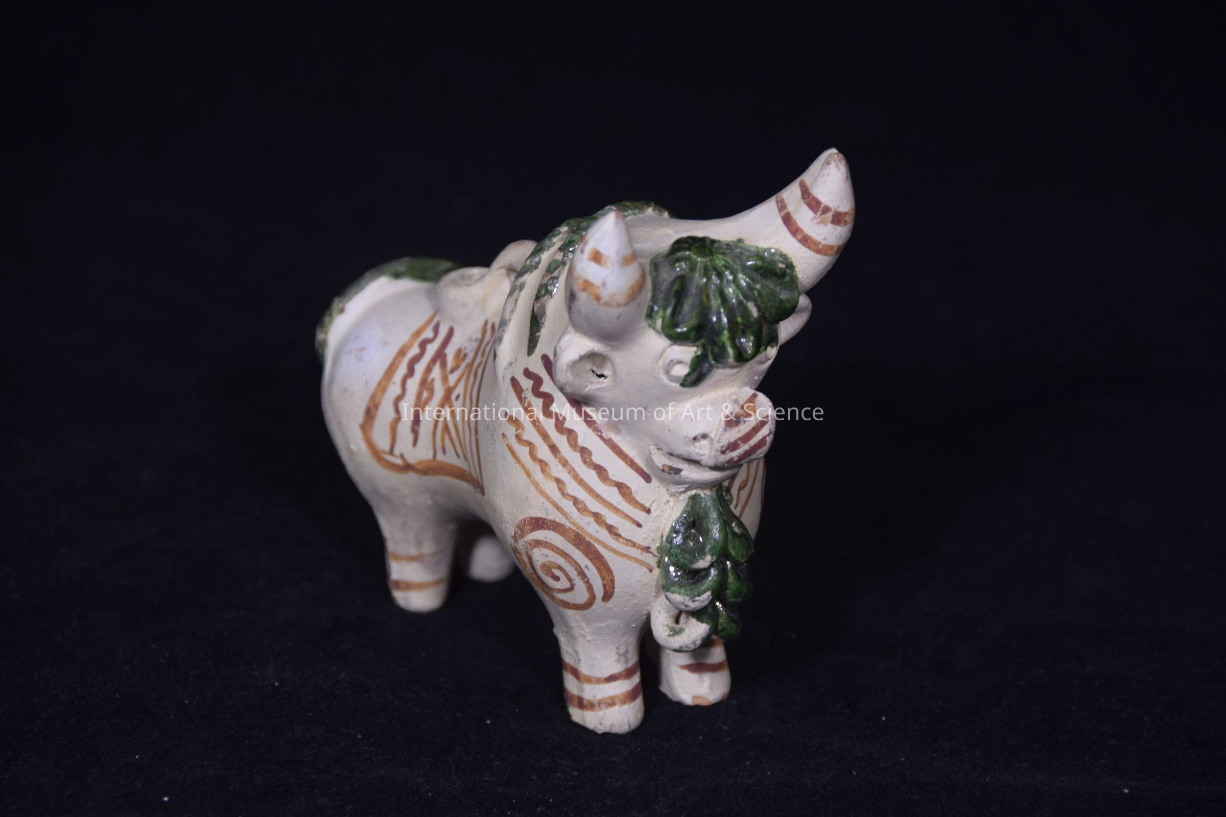 Pucara Bull. Lake Titicaca area, Peru. Pottery, brown paint, green glaze. 1982. Light cream colored with brown stipes and design on body; Forelock and chest, hump and tail covered with green glaze. A cermaic bull. It has a matte cream finish with matte brown brushwork and shiny green glaze brushwork. There is a circular handle located on the upper back with a small hole (reeds visible inside) below the handle.Dimensions