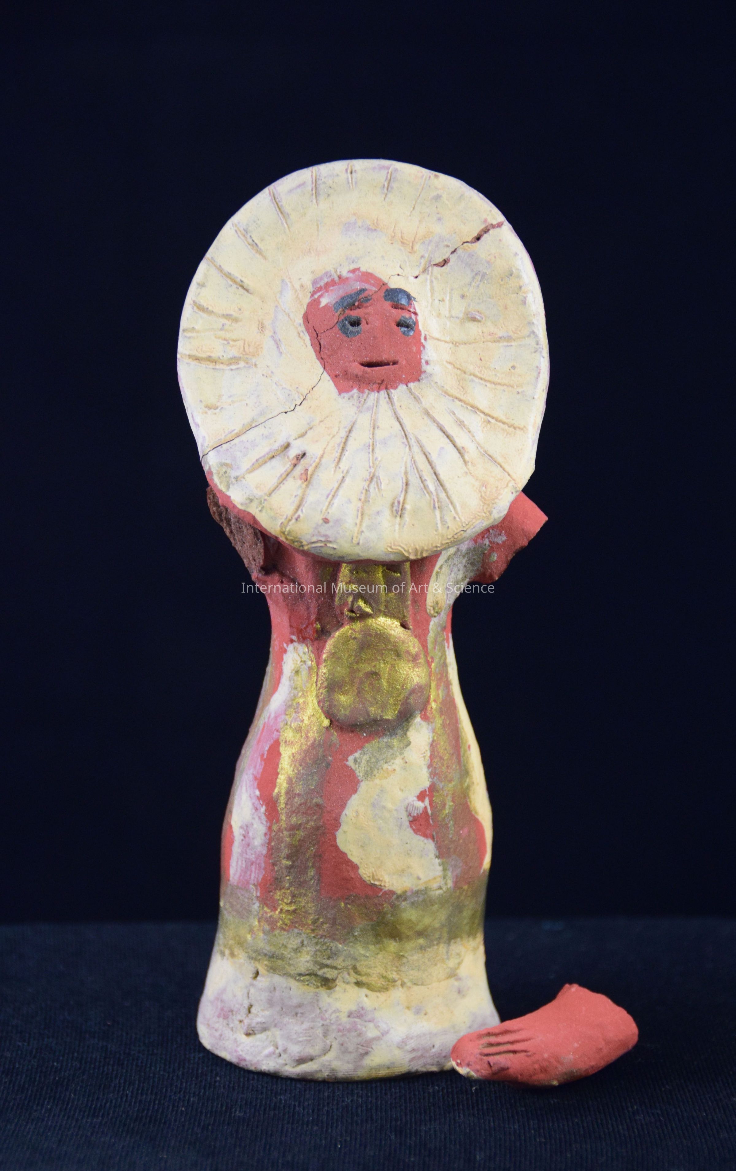 A painted clay figure. This figure is of a woman who has on a large headdress, a large necklace, and a decorated skirt. The clay is terracotta and the colors used are gold, back, and a cream.