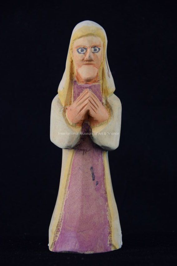 A wooden figurine. The figure has on a robe in pink, cream, and yellow. The figurine is part of a nativity scene.Ethnography