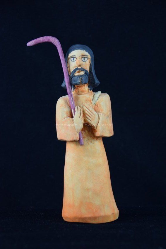 A wooden figurine of a man. The figure has on a robe in orange, and is holding a staff. The figurine is part of a nativity scene.Ethnography