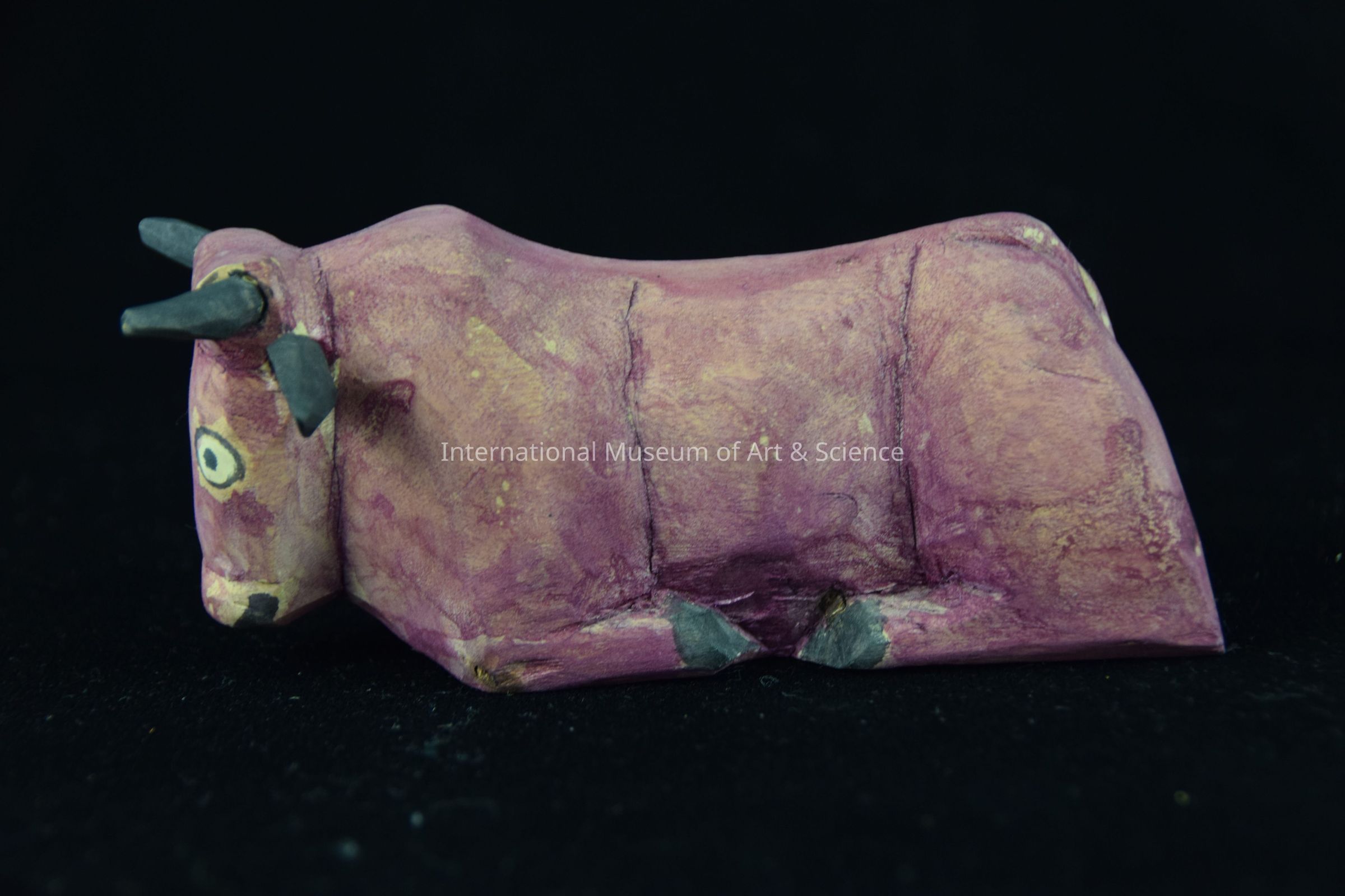 A wooden figurine of a seated bull. The piece is painted with purple, black, and white. The figurine is part of a nativity scene.Ethnography