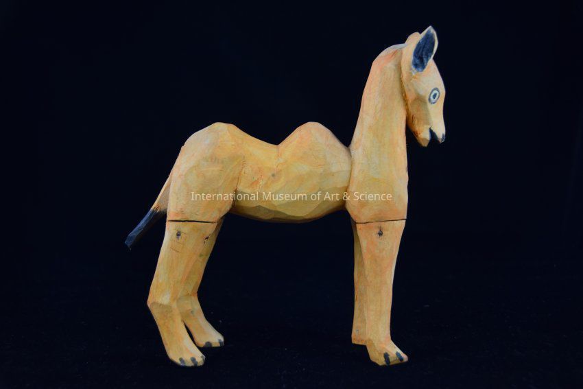 A wooden figurine of a camel. The piece is painted with orange, black, and white. The figurine is part of a nativity scene.Ethnography
