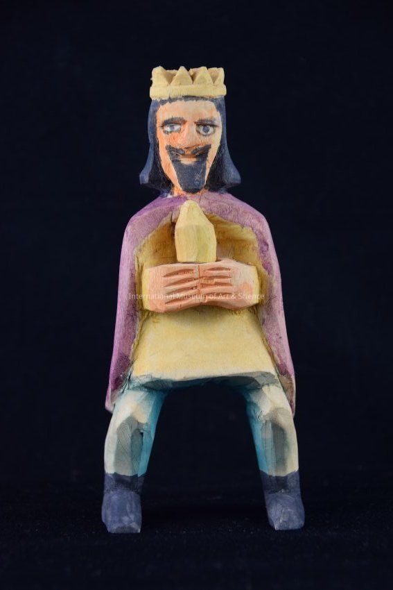 A wooden figurine of a man. The figure is in a seated position. The man has a purple cape, yellow crown, blue pants, black shoes, and a yellow shirt. He is holding a small box which can be removed.The figurine is part of a nativity scene.Ethnography