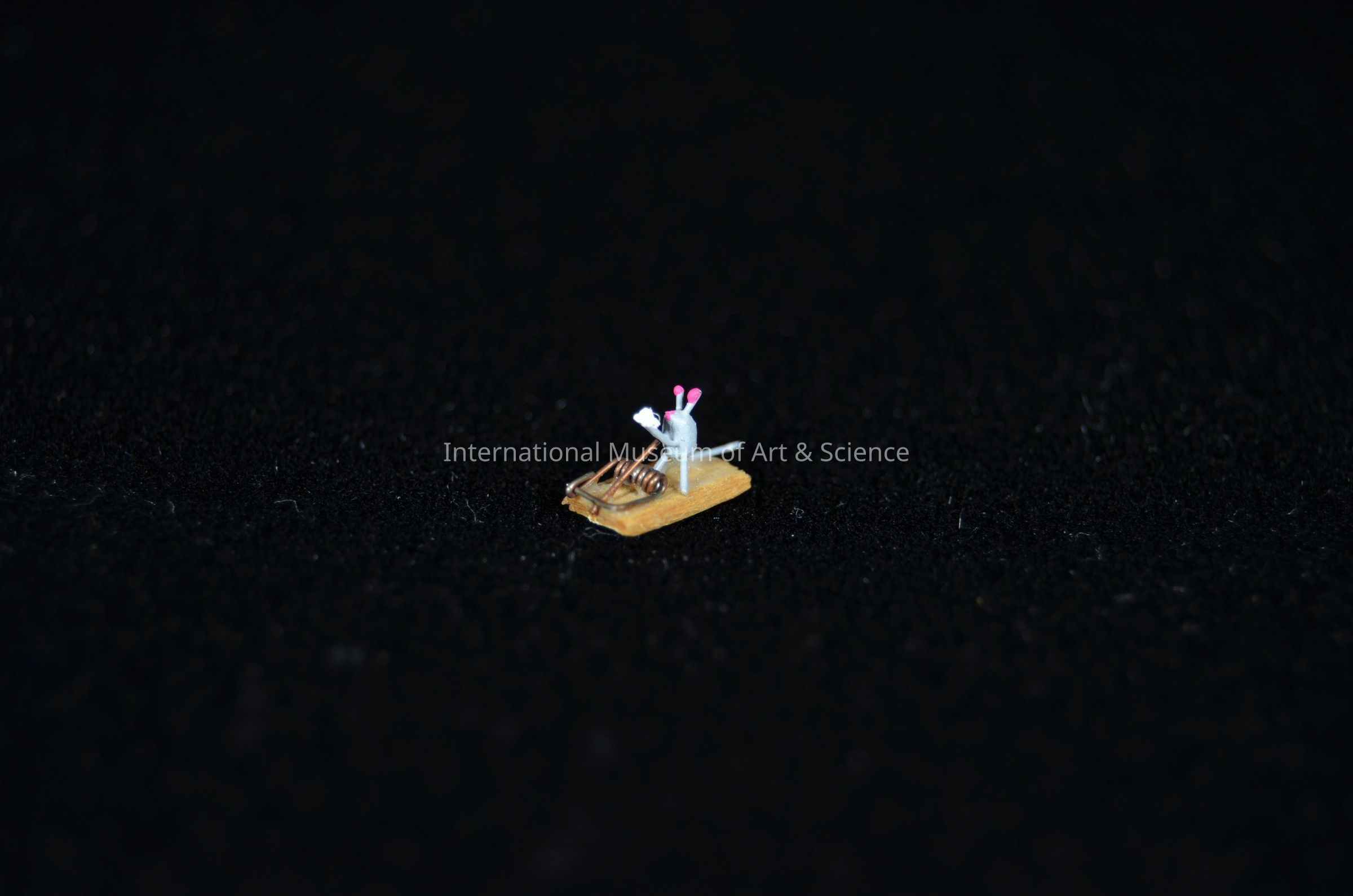A small figurine of a mouse sitting on mousetrap. The mouse is clay and has been painted grey. It sits on a wood base with wire detailing.Artwork Details