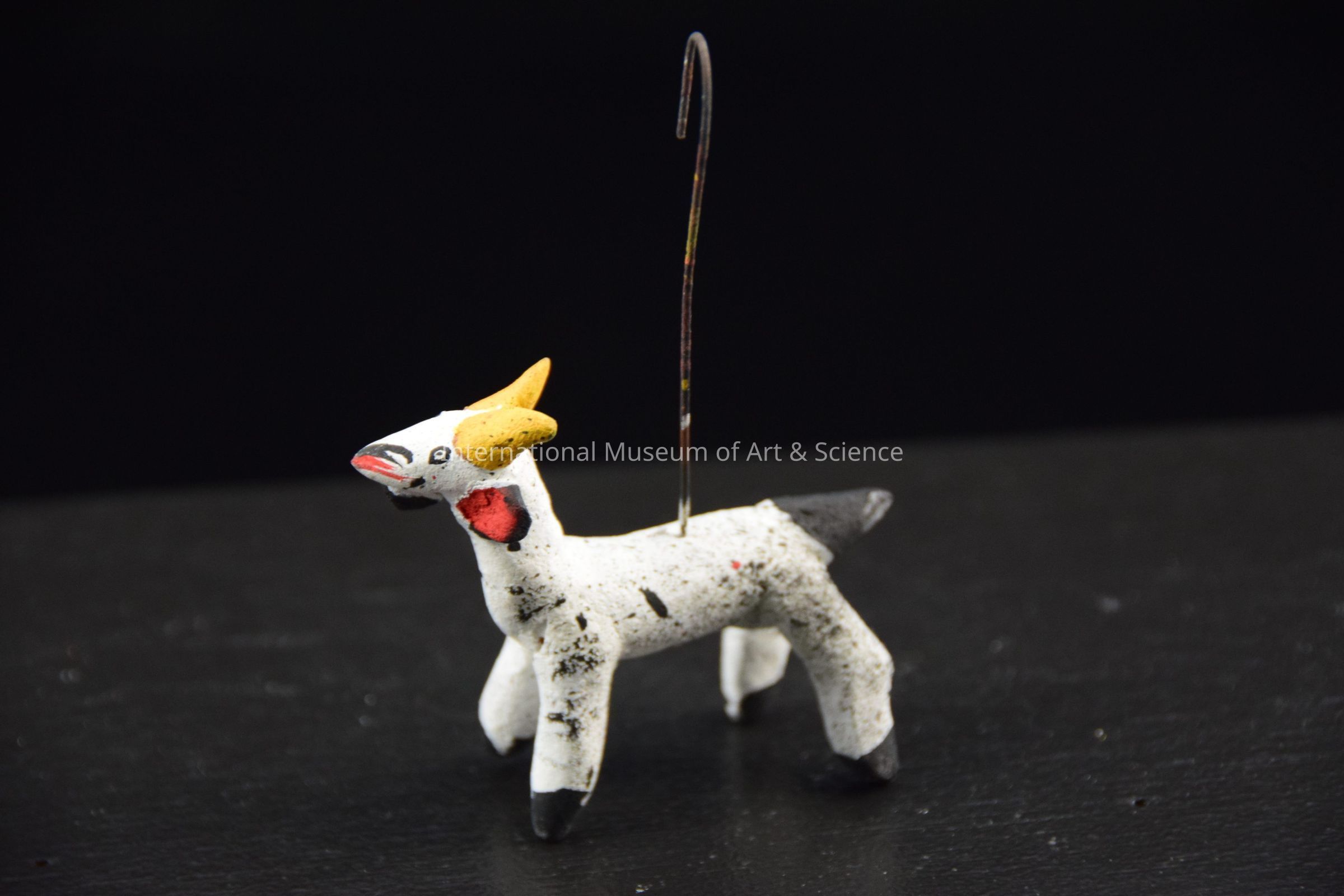 A ceramic figurine of a carousel animal. The animal is a goat with a white and black body, red ears, and yellow horns. There is a hooked wire through the body to attach it to the carousel.