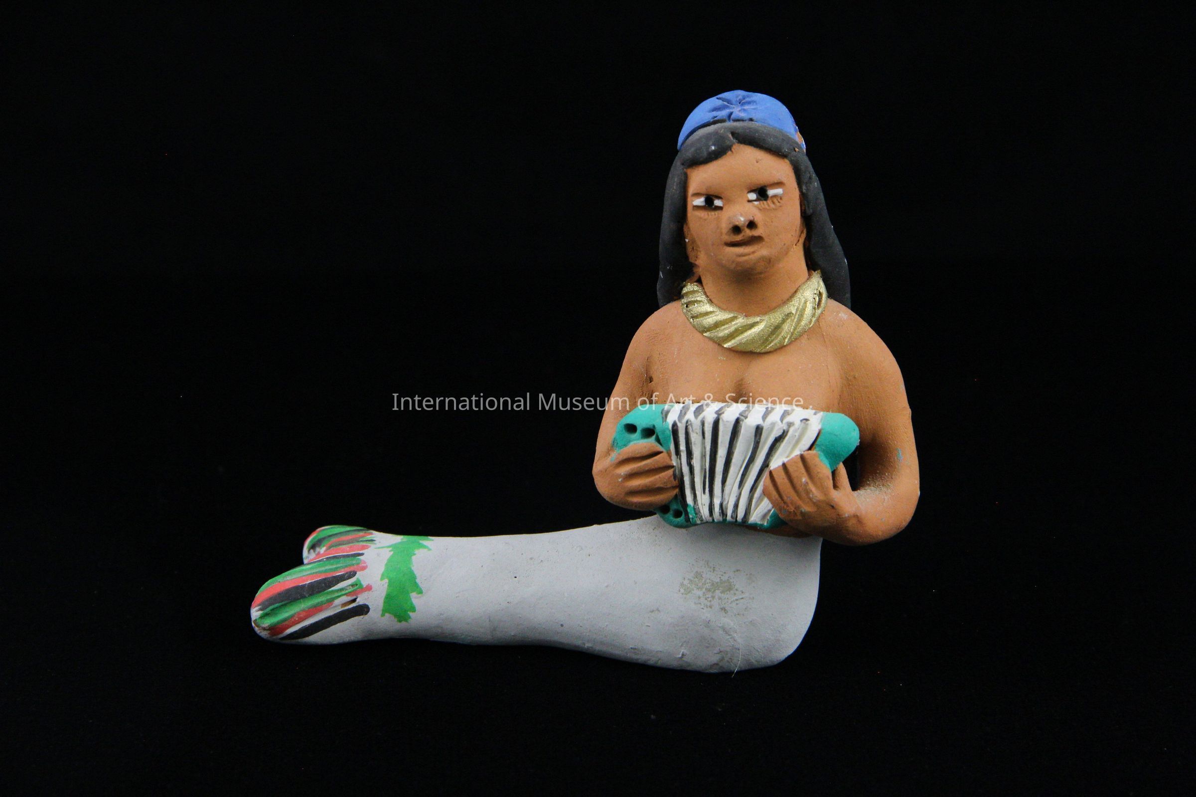 A ceramic figurine of a mermaid. The meraid is playing an accordion. The mermaid had dark skin with black hair in two braids. She is wearing a gold necklace, a blue head piece, and has a grey fin. She is holding the accordion with both hands.Dimensions