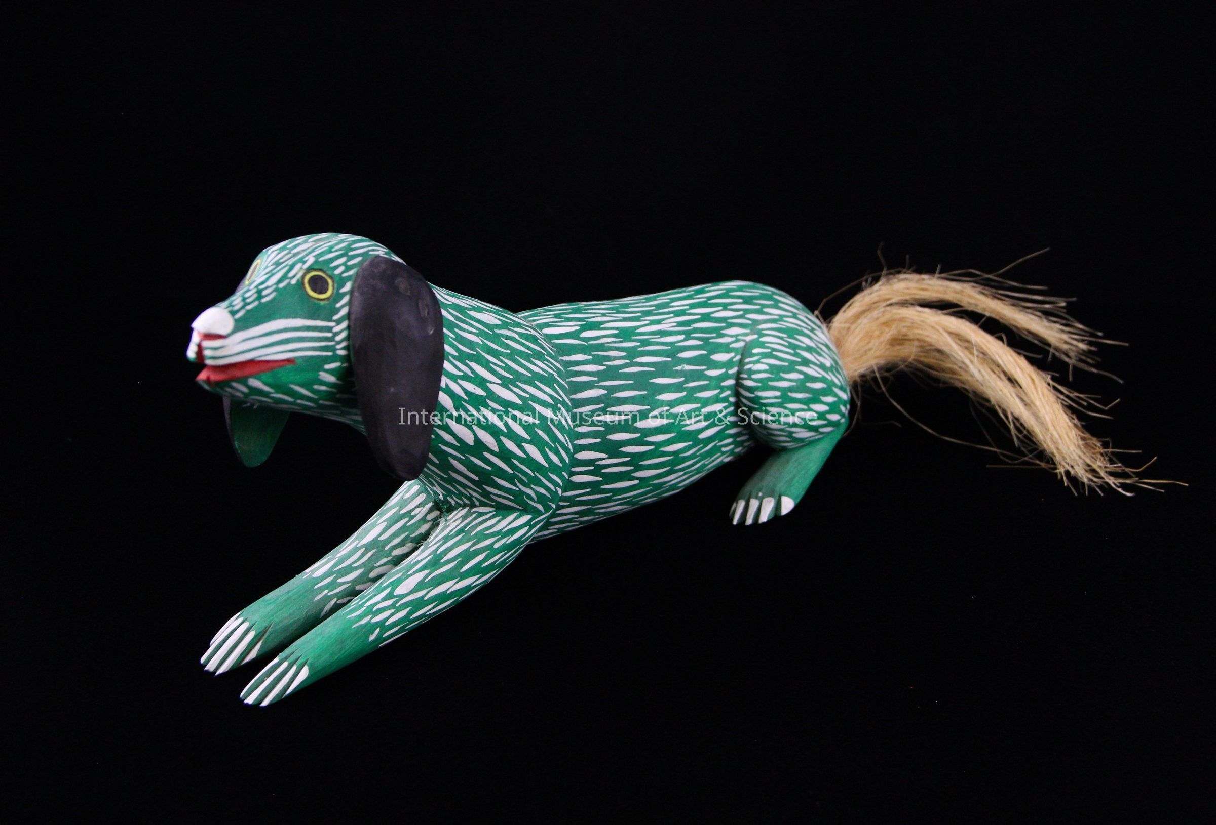 A wood carved figurine of a dog. The dog is painted green with white strokes creating a fur like texture. The dog has black ears and yellow and red details to its face. Its tail is ixtle fibers. The dog is in a laying position.Dimensions