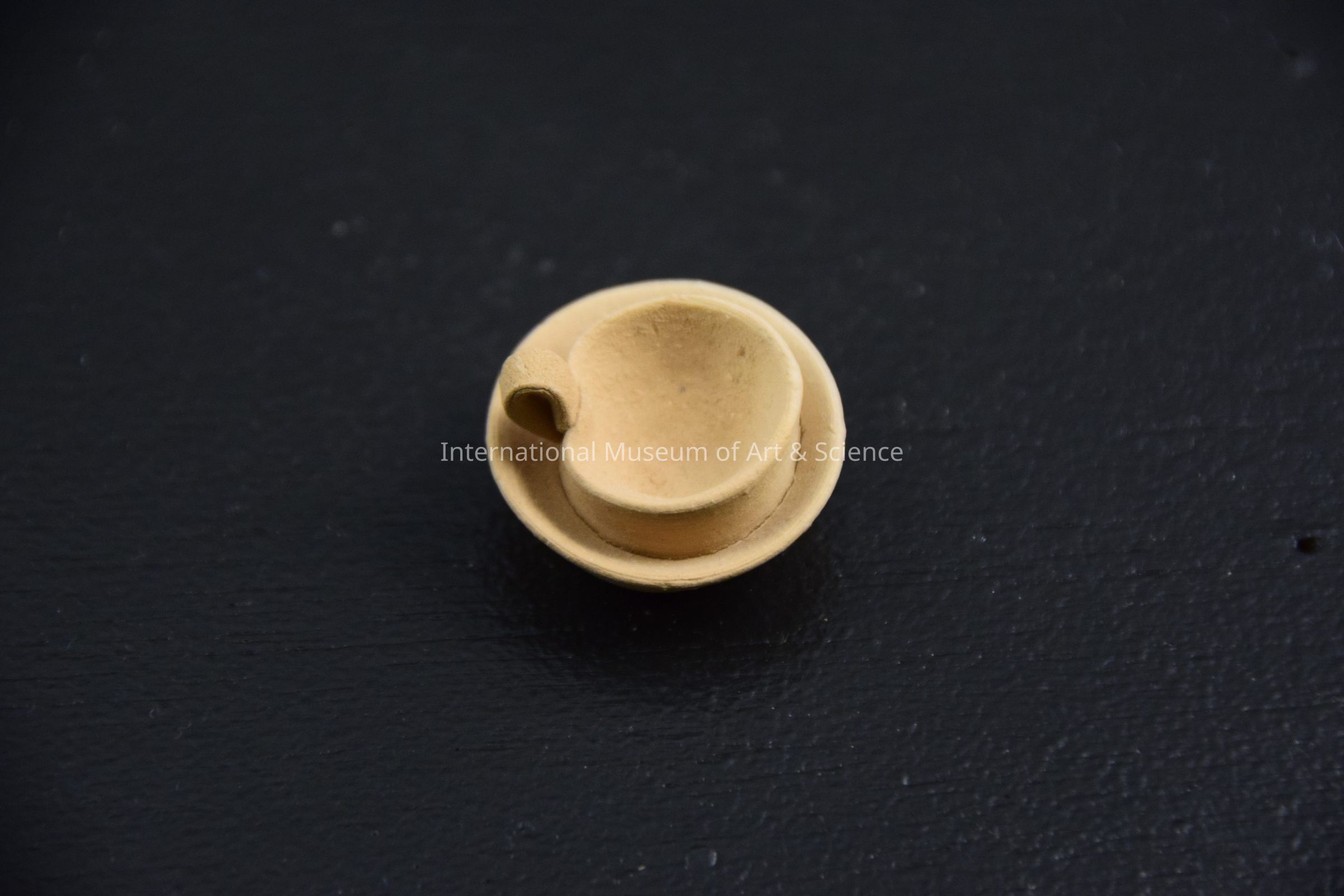A small ceramic figurine of a cup and saucer (joined). It is part of a Last Supper Scene.