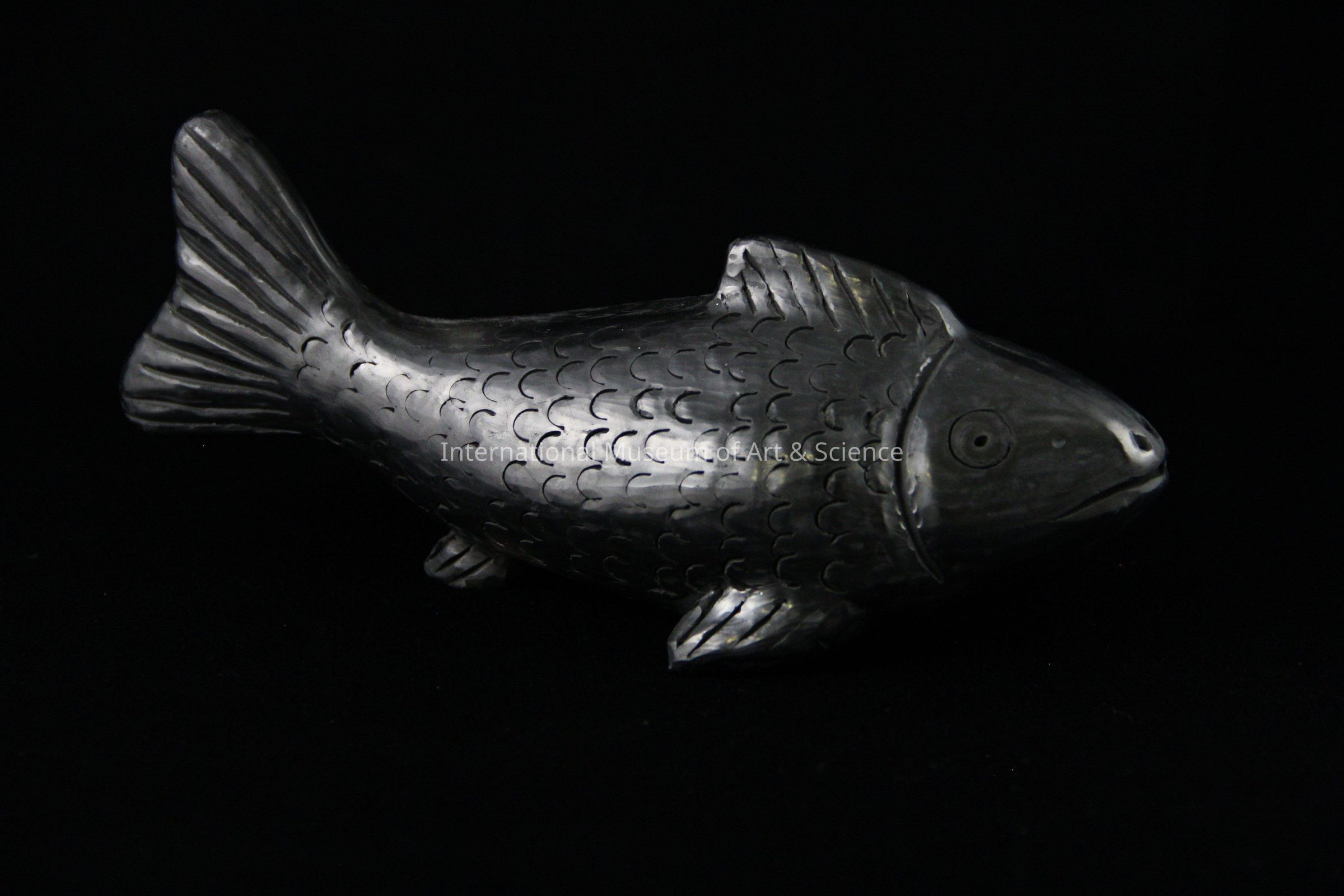 A black clay ceramic figurine of a fish. The piece has a burnished surface with the details of the fish like scales and fins carved in.Made/Created