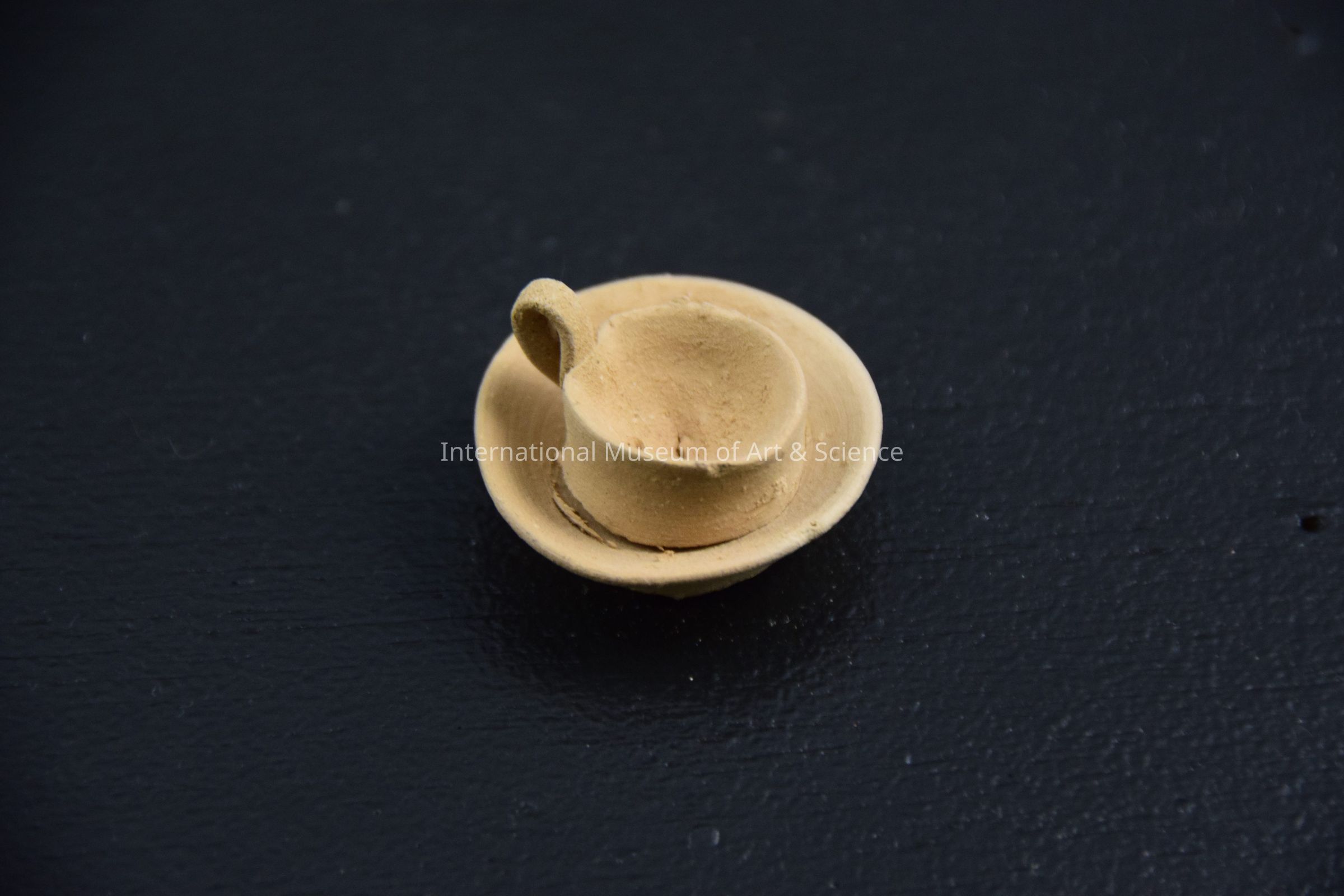 A small ceramic figurine of a cup and saucer (joined). It is part of a Last Supper Scene.