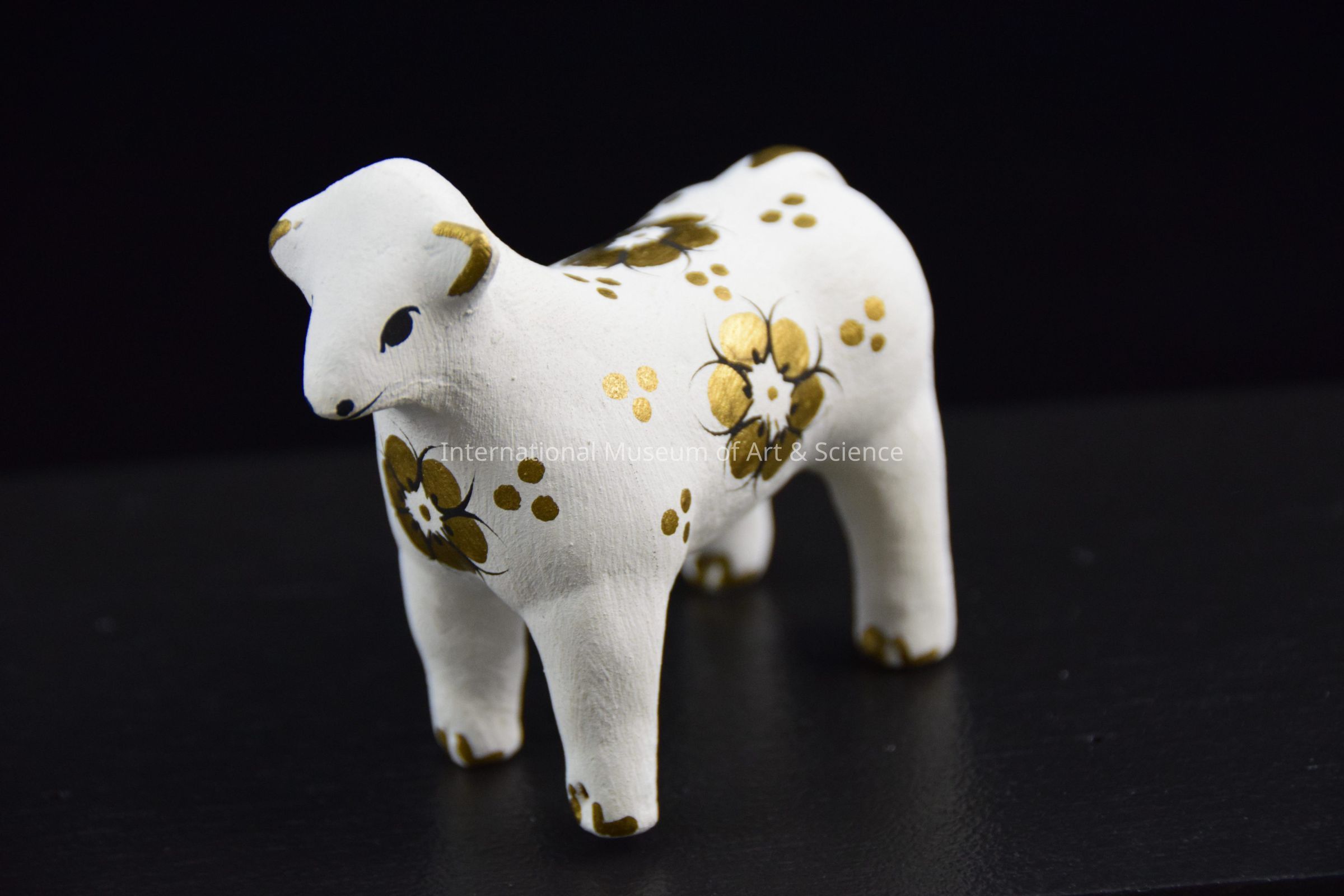 A ceramic figurine of a sheep. It is white with gold ears and tail. It is decorated with black and gold floral motifs. It is part of a 16 piece Nativity Set.Dimensions