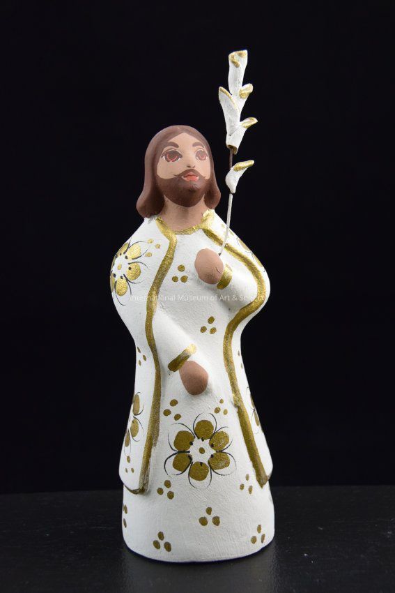 A ceramic figurine of St. Joseph. He is wearing a white robe, cape, and a hat on his back. He is holding flowers in his left hand. His outfit is decorated with black and gold floral motifs. He is part of a 16 piece Nativity Set.Dimensions