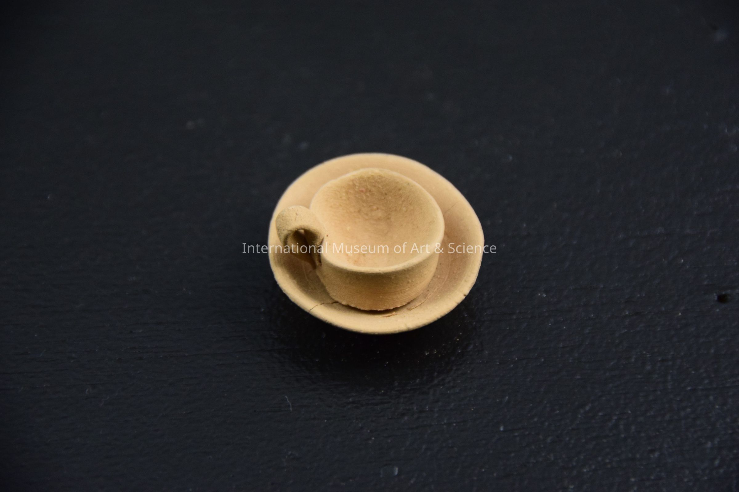 A small ceramic figurine of a cup and saucer (joined). It is part of a Last Supper Scene.