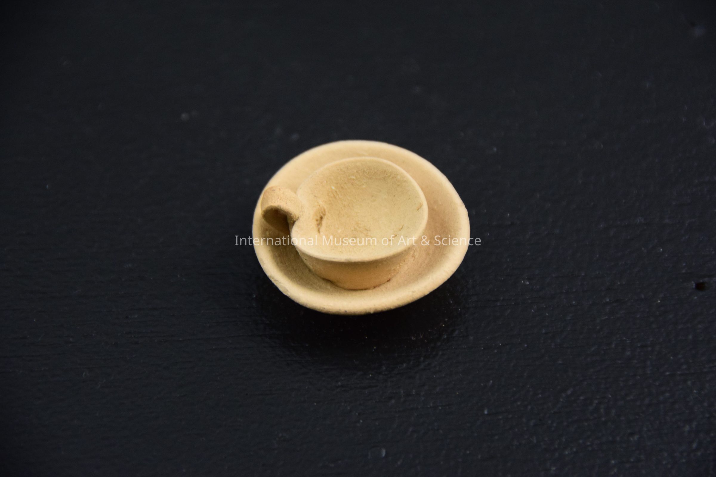 A small ceramic figurine of a cup and saucer (joined). It is part of a Last Supper Scene.