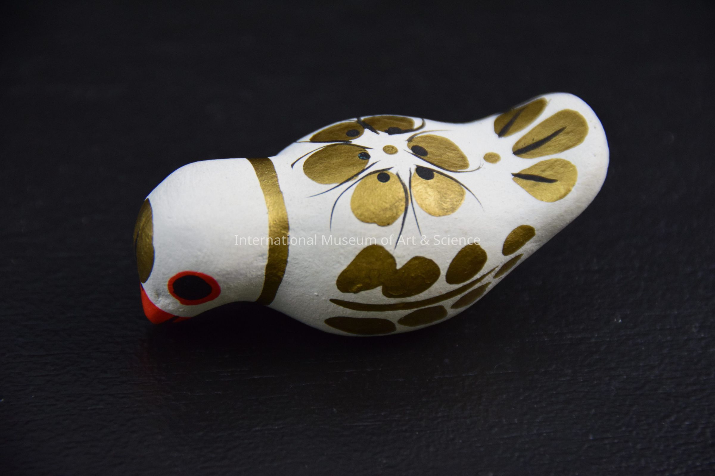 A ceramic figurine of a bird. It is white with orange and black eyes, an orange beak, and gold and black floral detailing. It is part of a 16 piece Nativity Set.Dimensions