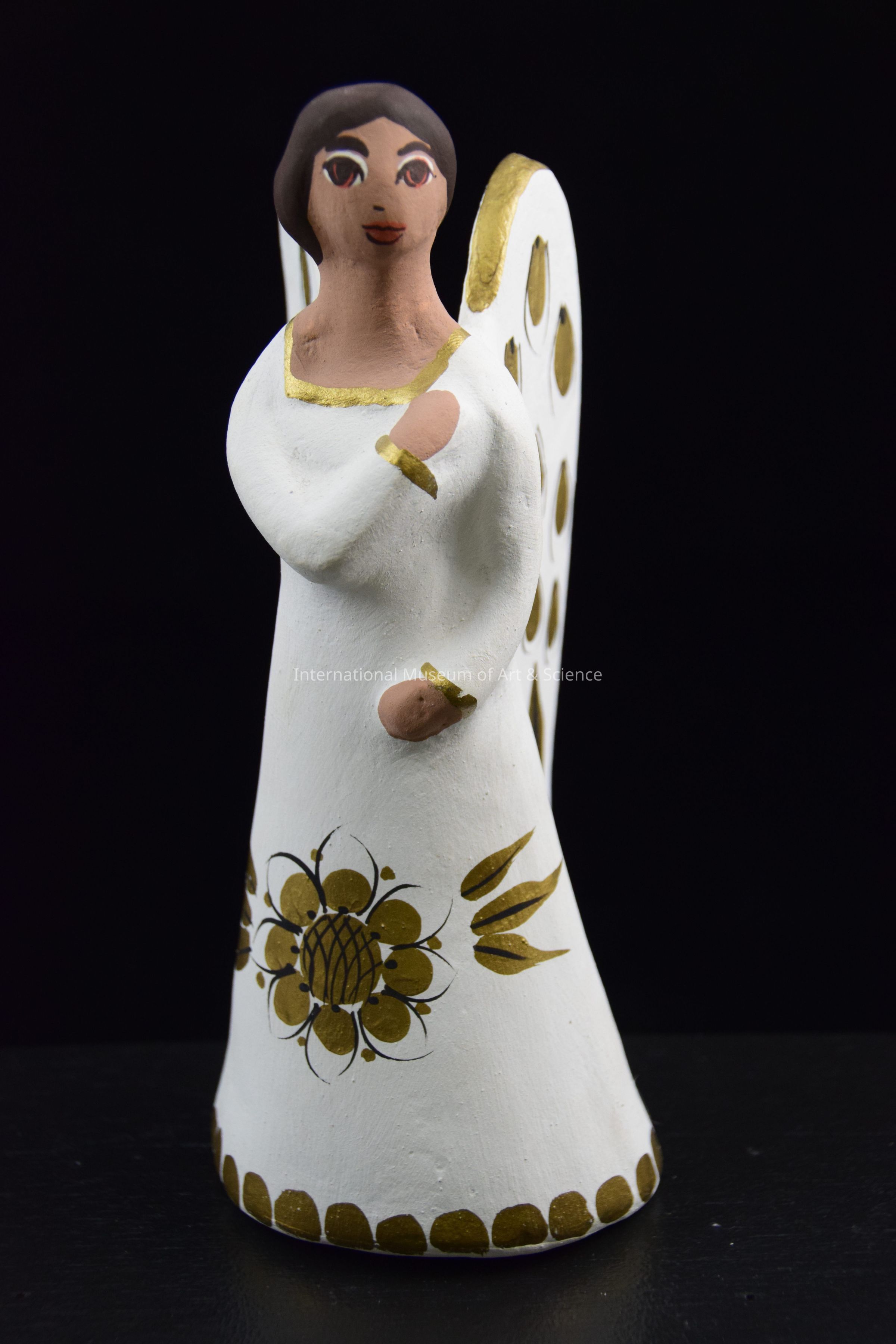 A ceramic figurine of a female Angel. She is wearing a white dress and has wings. Her outfit is decorated with black and gold floral motifs. She is part of a 16 piece Nativity Set.Dimensions