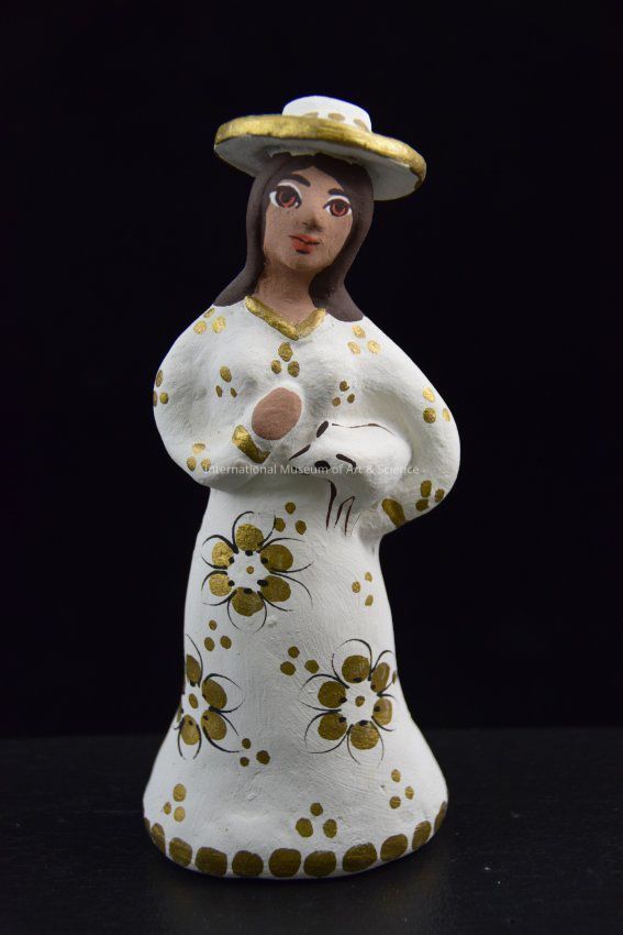 A ceramic figurine of a Sheperd Woman. She is wearing a white dress and a hat. She is holding a lamb under her left arm. Her outfit is decorated with black and gold floral motifs. She is part of a 16 piece Nativity Set.Dimensions