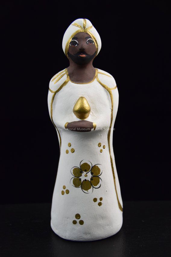 A ceramic figurine of a Wiseman/Magi. He is wearing a white robe, cape, and a head scraf. He is holding a gold gift in his hands. His outfit is decorated with black and gold floral motifs. He is part of a 16 piece Nativity Set.Dimensions