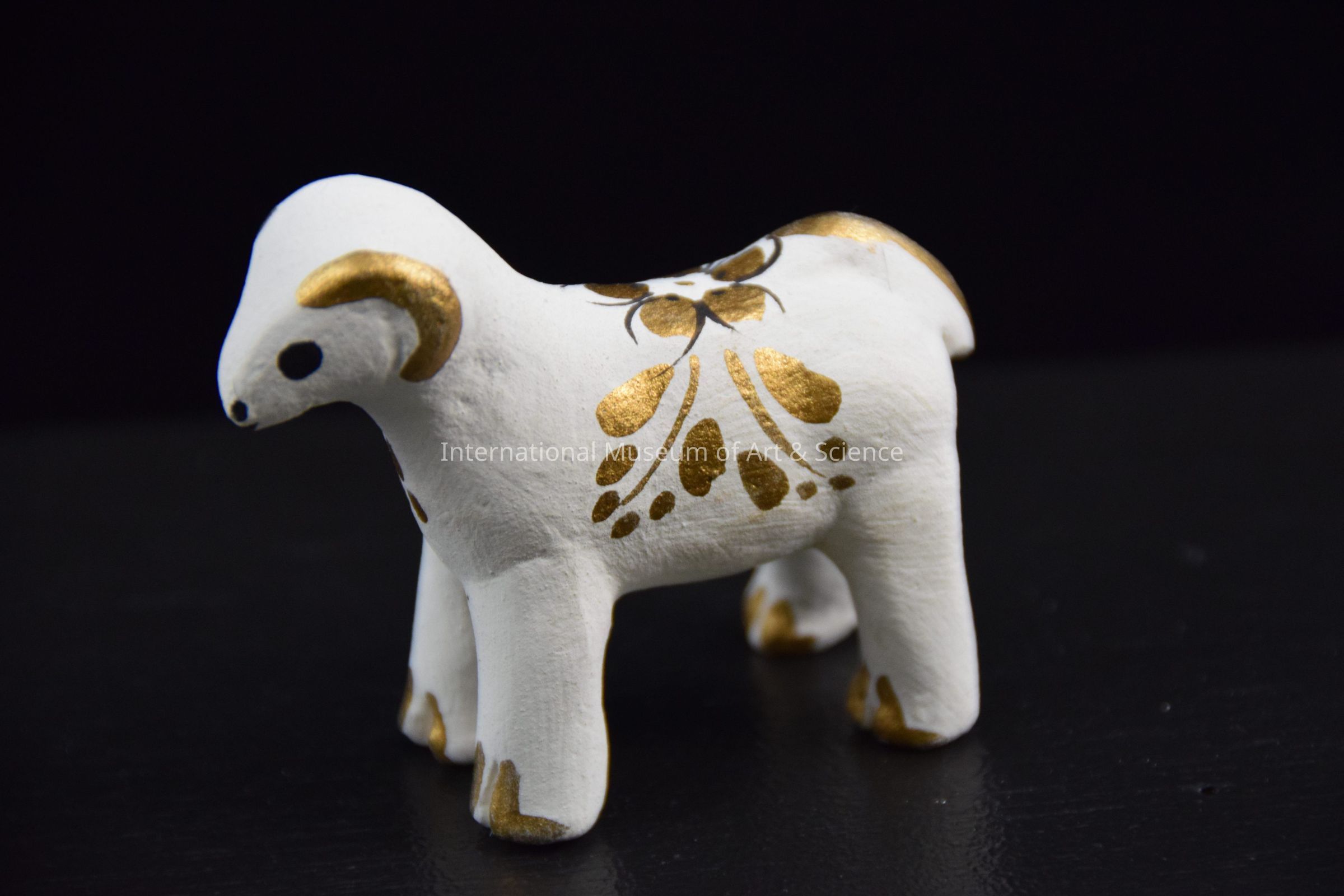 A ceramic figurine of a goat/ram. It is white with gold horns and tail. It is decorated with black and gold floral motifs. It is part of a 16 piece Nativity Set.Dimensions