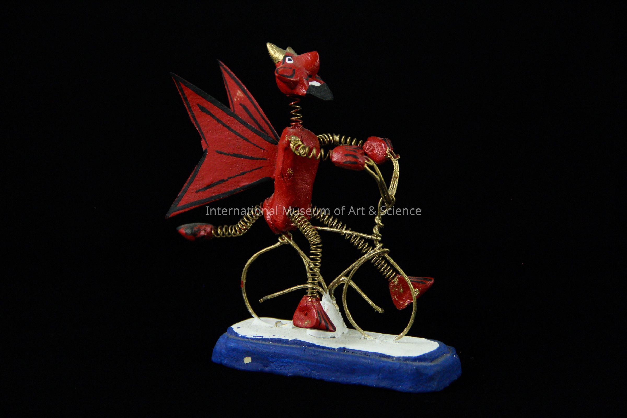 A winged devil figurine, riding a wire bicycle. The devil is made of springed wire with a clay body, head, hands and feet. The wire bicycle is painted gold. The figure is on a clay base that is painted blue and white.Artwork Details