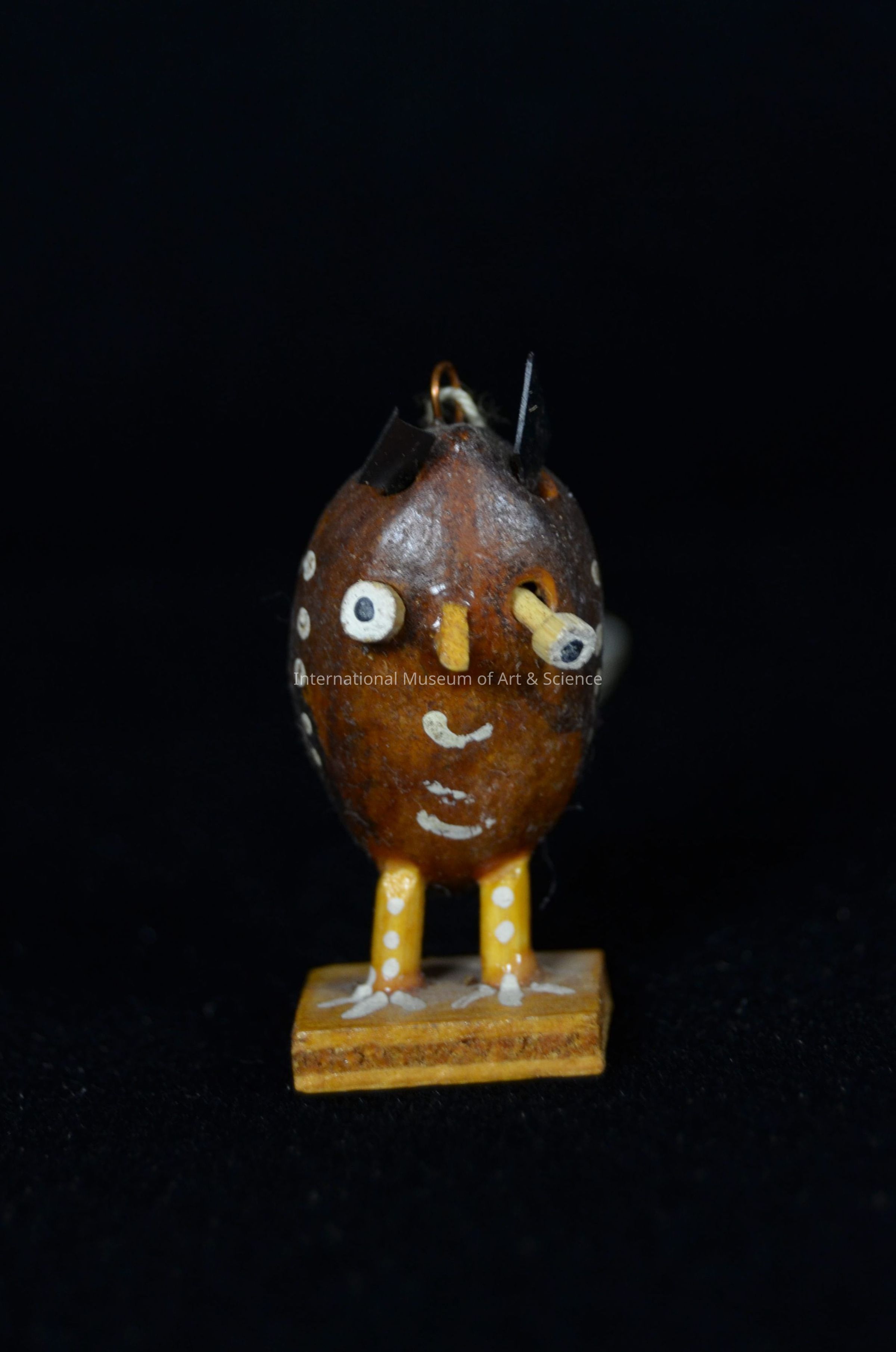 A miniature bird with moveable eyes. The bird's body is made of a pecan shell. it has black plastic ears, and a pointed wooden tail. Its eyes are painted black and white. There are white dots on the body and feet. There is a wire hook on head tied with string for hanging.Artwork Details