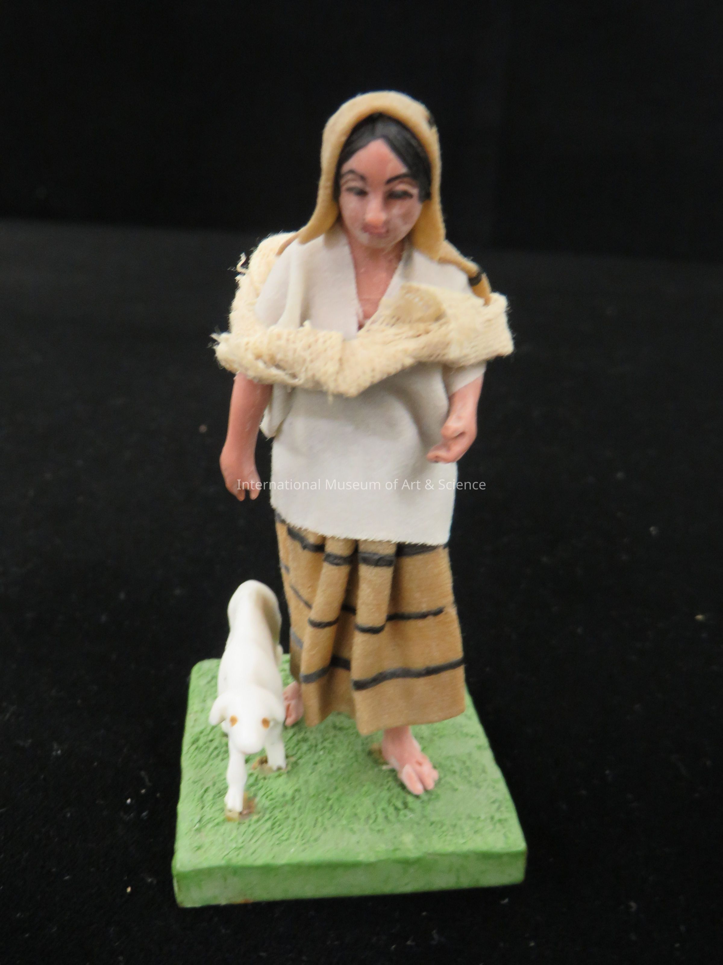 Wax figure of woman dressed in white blouse, brown skirt with black stripes and matching head scarf; burlap type bundle on back; white dog at side; base of wood covered with green wax.Dimensions