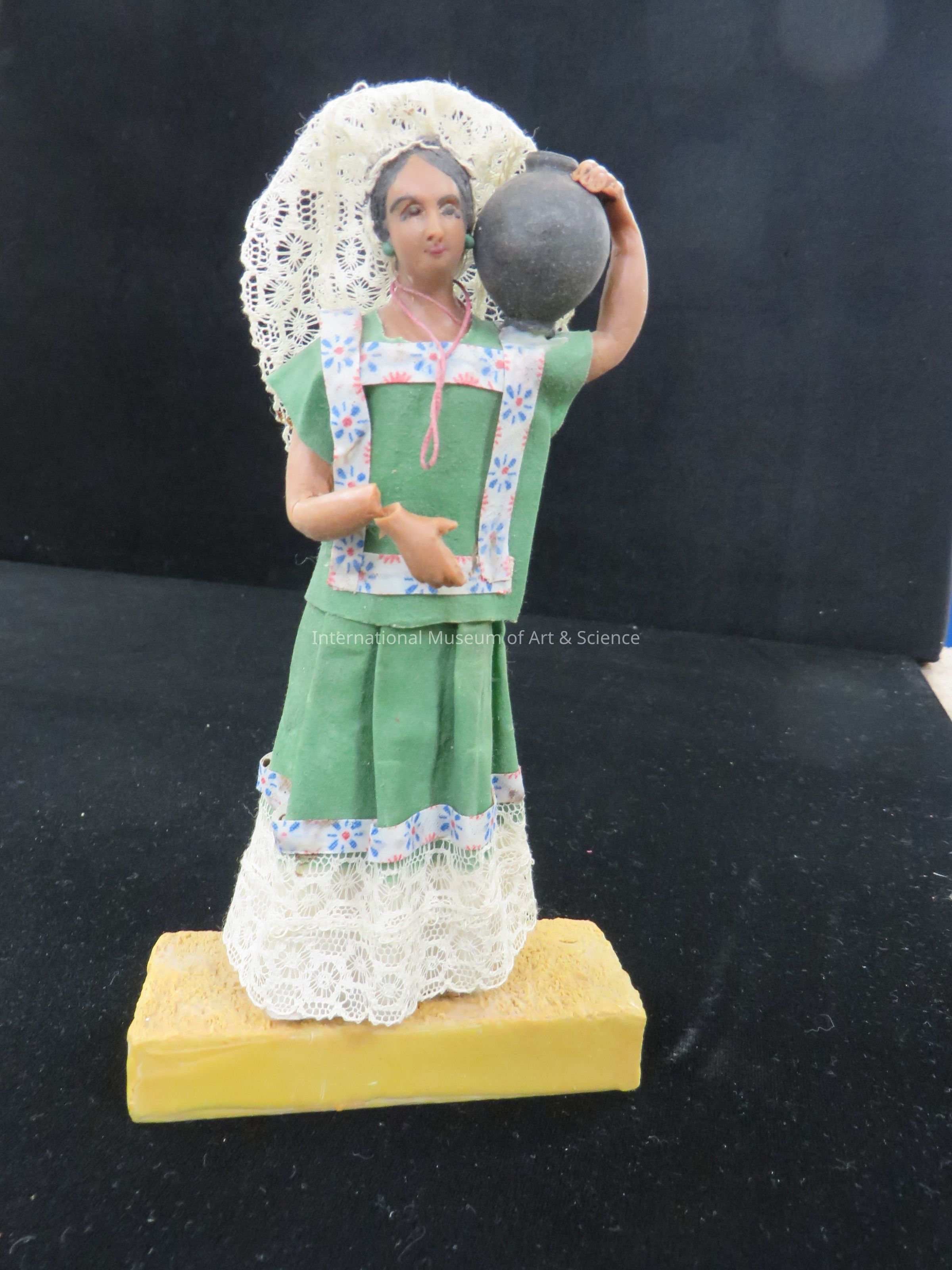 Wax figure of woman, green dress trimmed with white lace, headdress of white lace, black jug on shoulder; base of wood covered with tan wax.Artwork Details