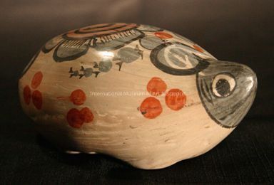 A ceramic figurine of a turtle. The body of the animal is grey with orange, black, and grey floral details on the back.