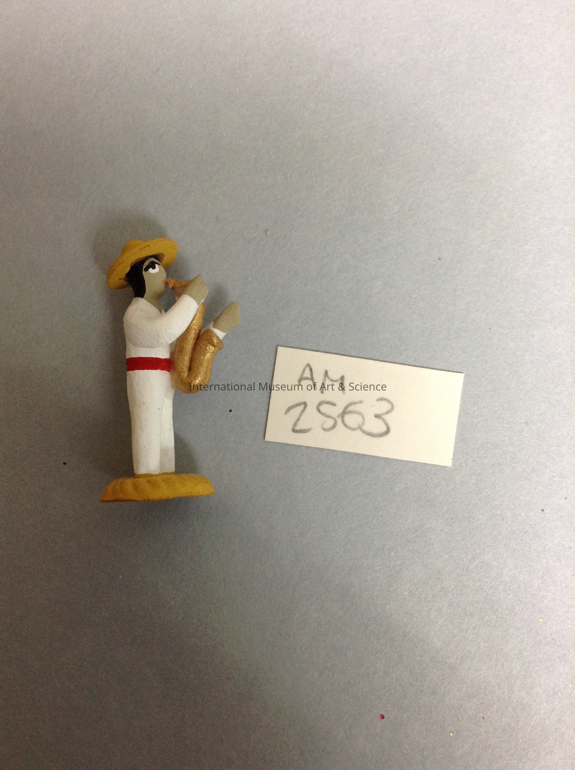 A miniature wooden figurine of a male jalisco garb playing a gold saxaphone. The figure is wearing white clothing and a yellow sombrero. The figuine is part of a nine figure jalisco group.Artwork Details