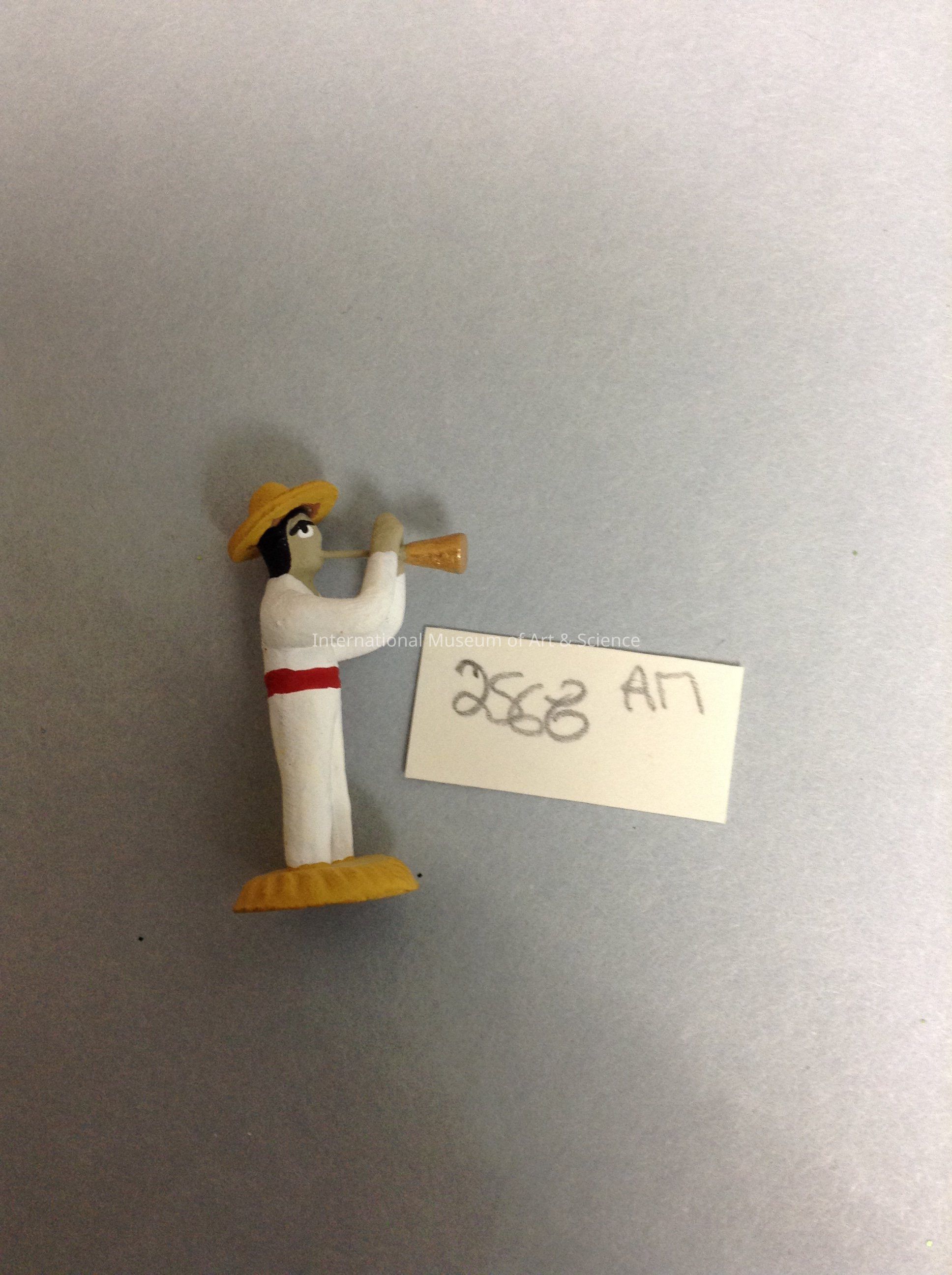 A miniature wooden figurine of a male jalisco garb playing a gold clarinet. The figure is wearing white clothing and a yellow sombrero. The figuine is part of a nine figure jalisco group.Artwork Details