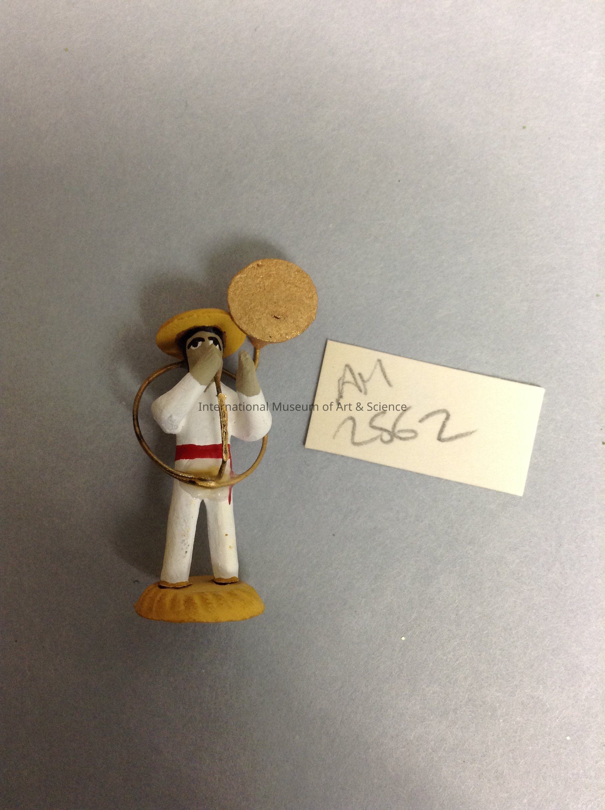A miniature wooden figurine of a male jalisco garb playing a gold sousaphone. The figure is wearing white clothing and a yellow sombrero. The figuine is part of a nine figure jalisco group.Artwork Details