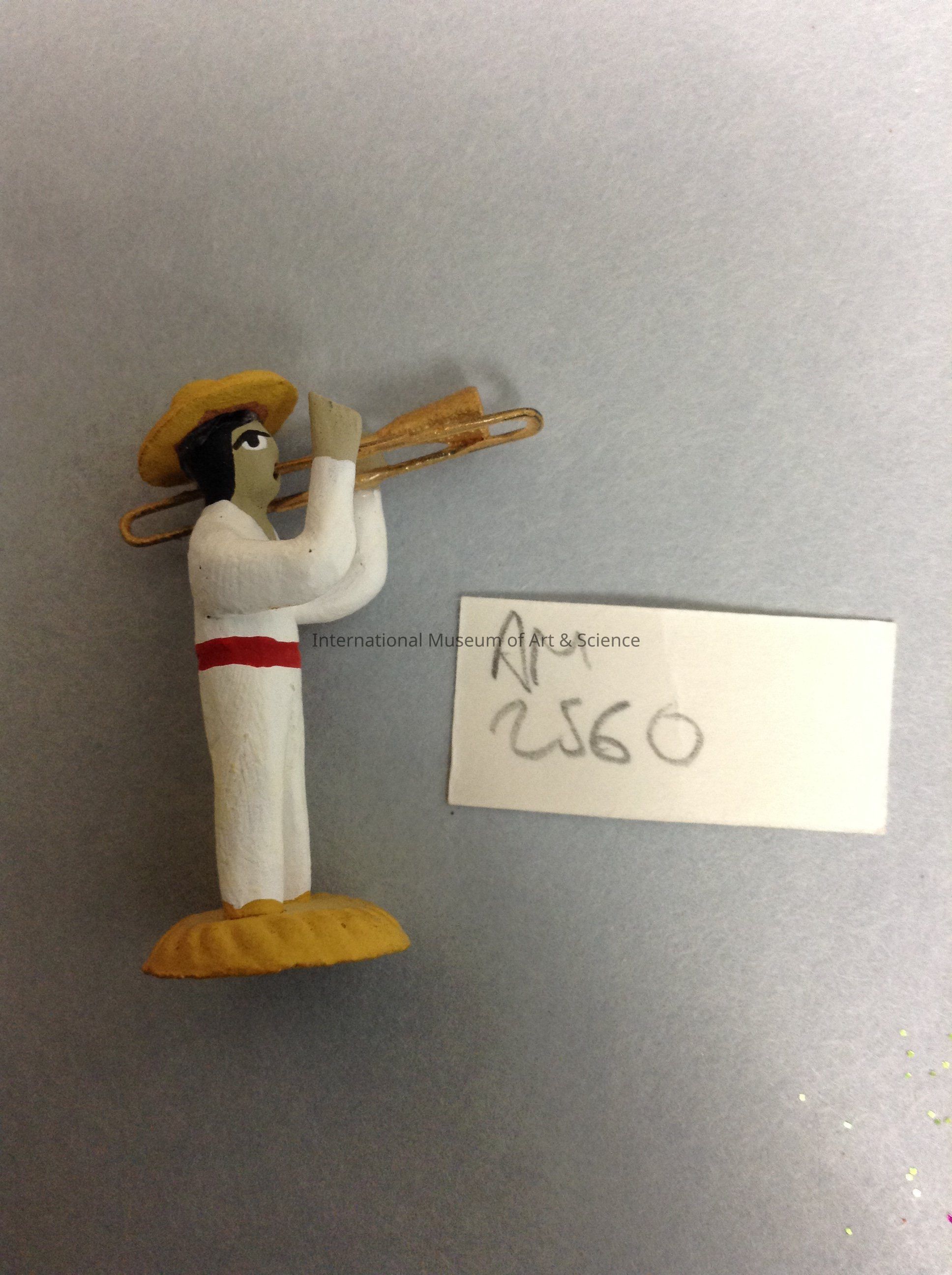 A miniature wooden figurine of a male jalisco garb playing a gold trombone. The figure is wearing white clothing and a yellow sombrero. The figuine is part of a nine figure jalisco group.Artwork Details