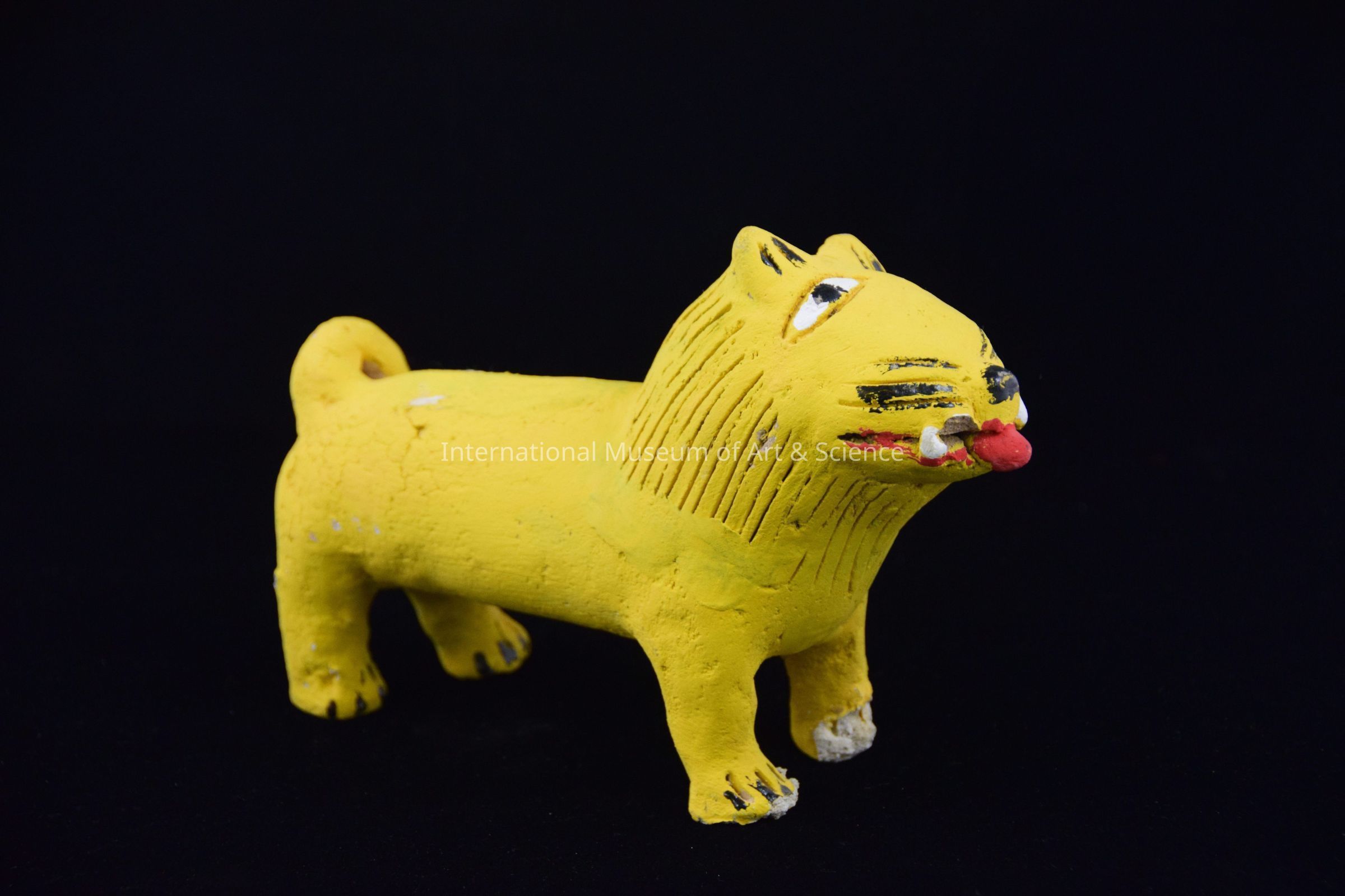 A clay lion figurine. The lion is made of clay and painted yellow; incised linear designs as the lions mane; curved tail; linear incised designs at the mouth as whiskers and on the feet as toes; red painted tongue and lips; three white clay teeth; white and black oval eyes; long rectangular body, four short feet.Dimensions