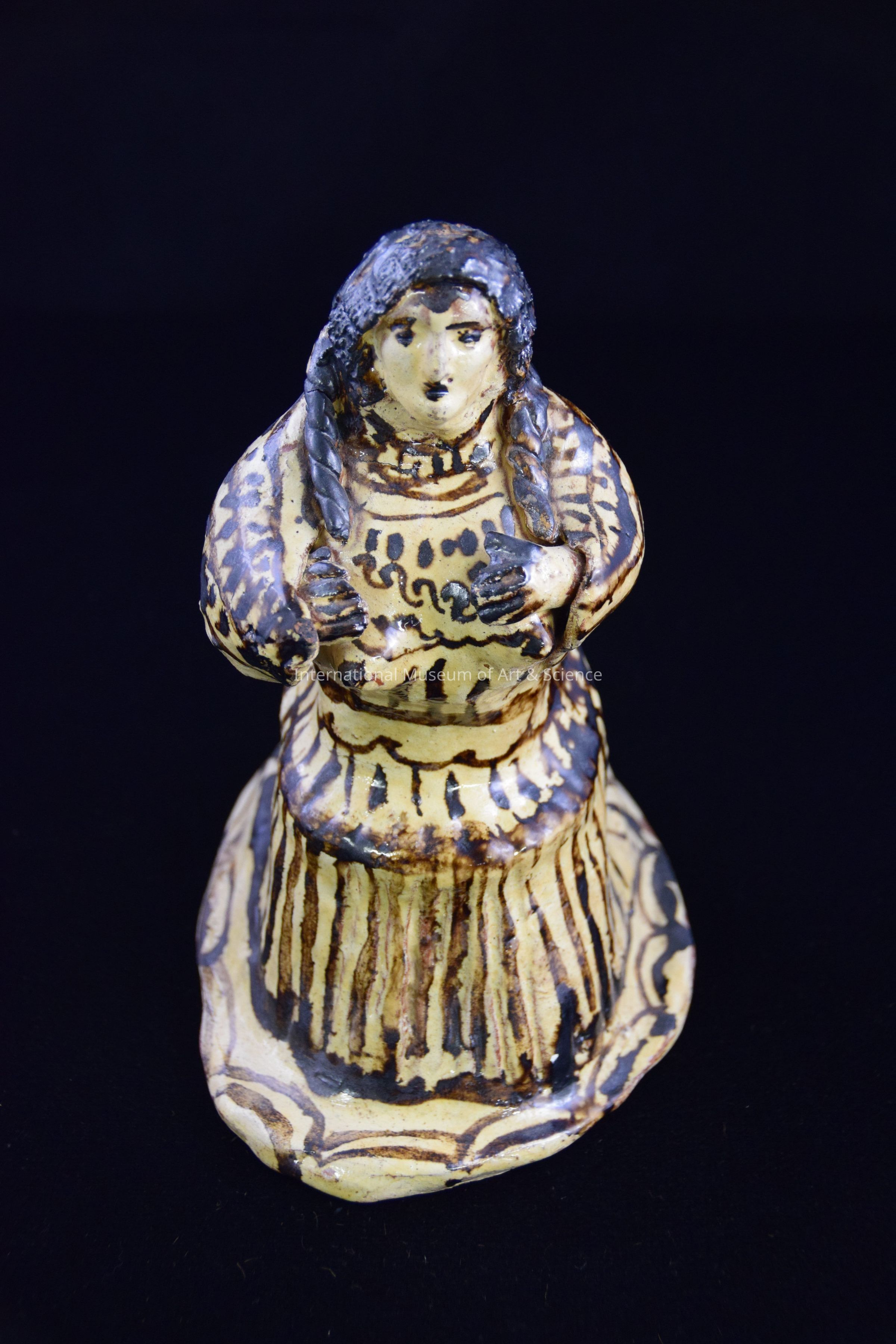 A ceramic figurine of a woman. The woman has braided hair, is wearing a dress, and a rebozo. She has her hands resting on her chest. The figure is glazed in cream and brown. The figure may be part of a Nativity scene.Artwork Details