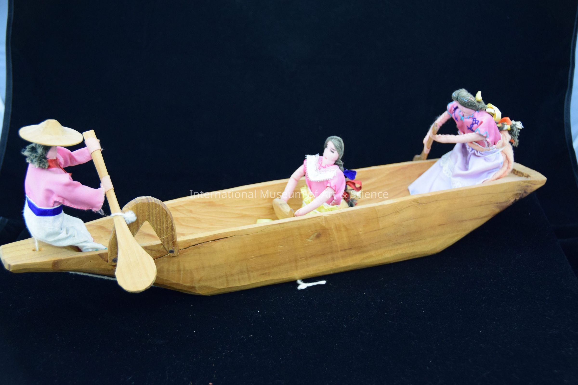 A carved wooden canoe with 3 figures inside. There is one male and two females in the boat. Two of the figures are rowing a one is holding a fish. The man is wearing a pink shirt, cream pants with a purple sash. Both women are wearing pink and yellow shirts with lavendar skirts. There is a pull string on the base.Artwork Details