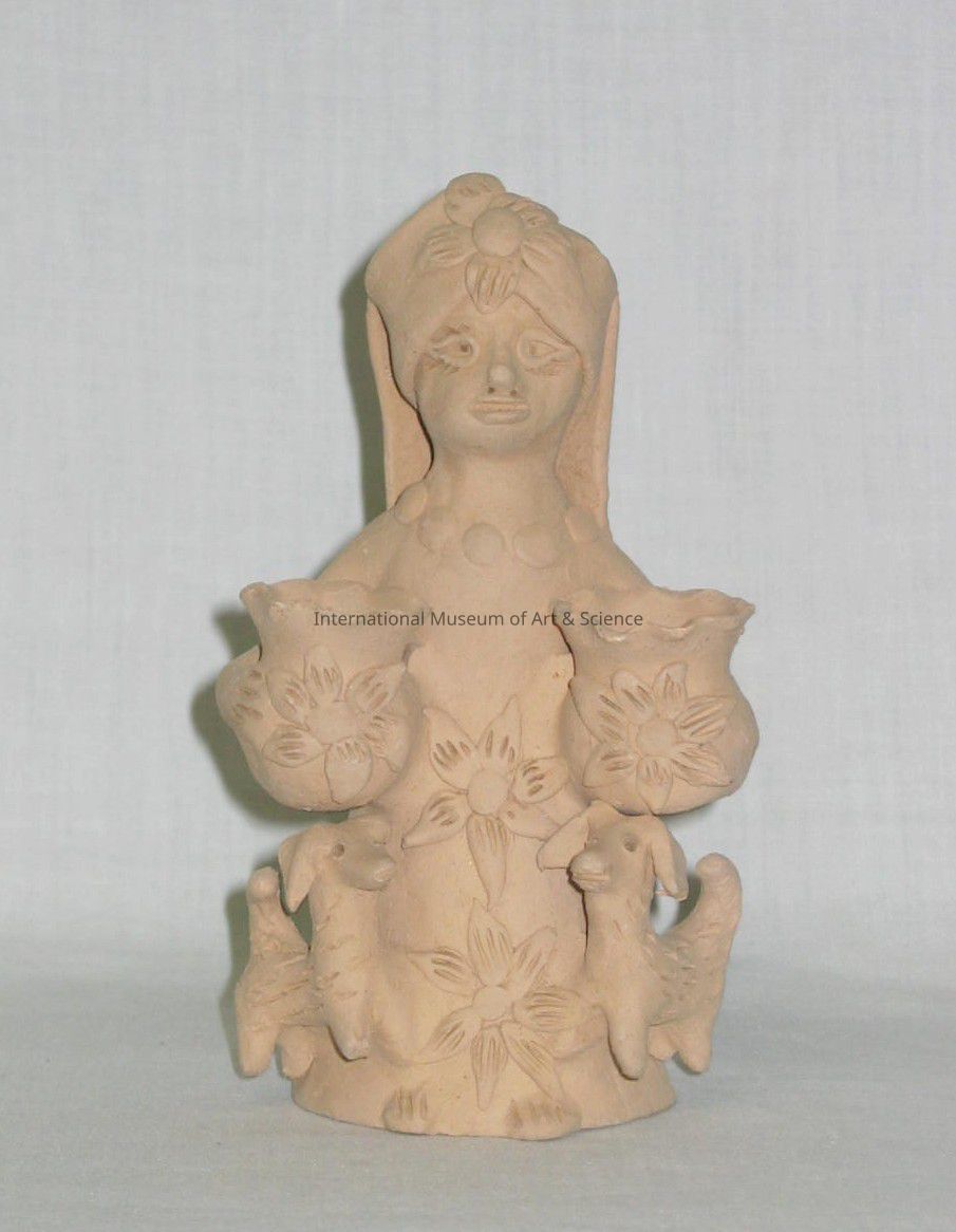 A clay figurine of a woman. The woman is holding a pot under each arm, and has two dogs at her feet. She is wearing a head scraf with a flower on the front, her dress also has flowers on it.