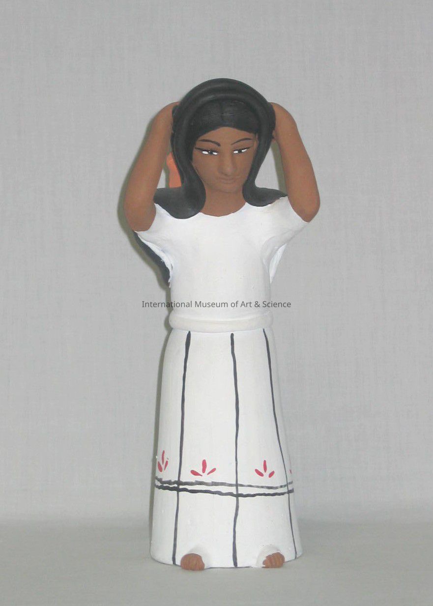 A clay figurine of a woman in traditional dress of a white dress with detailing at the bottm and a black veil. She is carrying a backet behind her.Made/Created